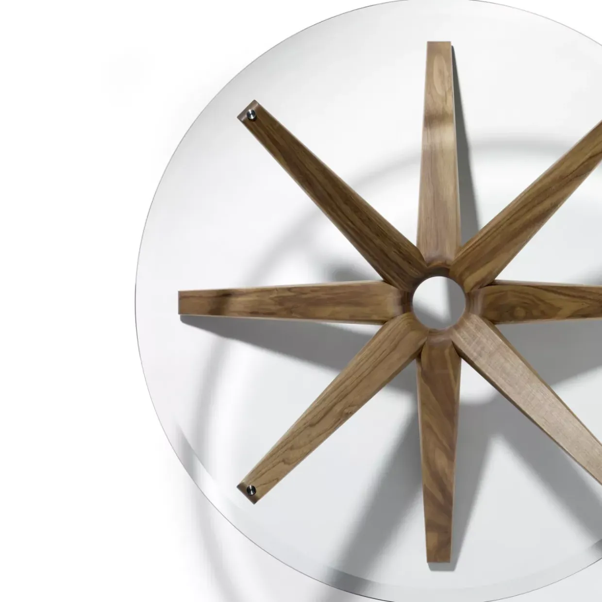Der moderne Stil trifft auf klassische Elemente. Der runde Couchtisch Stern präsentiert sich in einem harmonischen Zusammenspiel von Holz und Glas. Die Tischplatte aus Klarglas bietet eine klare Oberfläche, die das darunterliegende Holz in Eiche Naturöl gekonnt zur Geltung bringt.