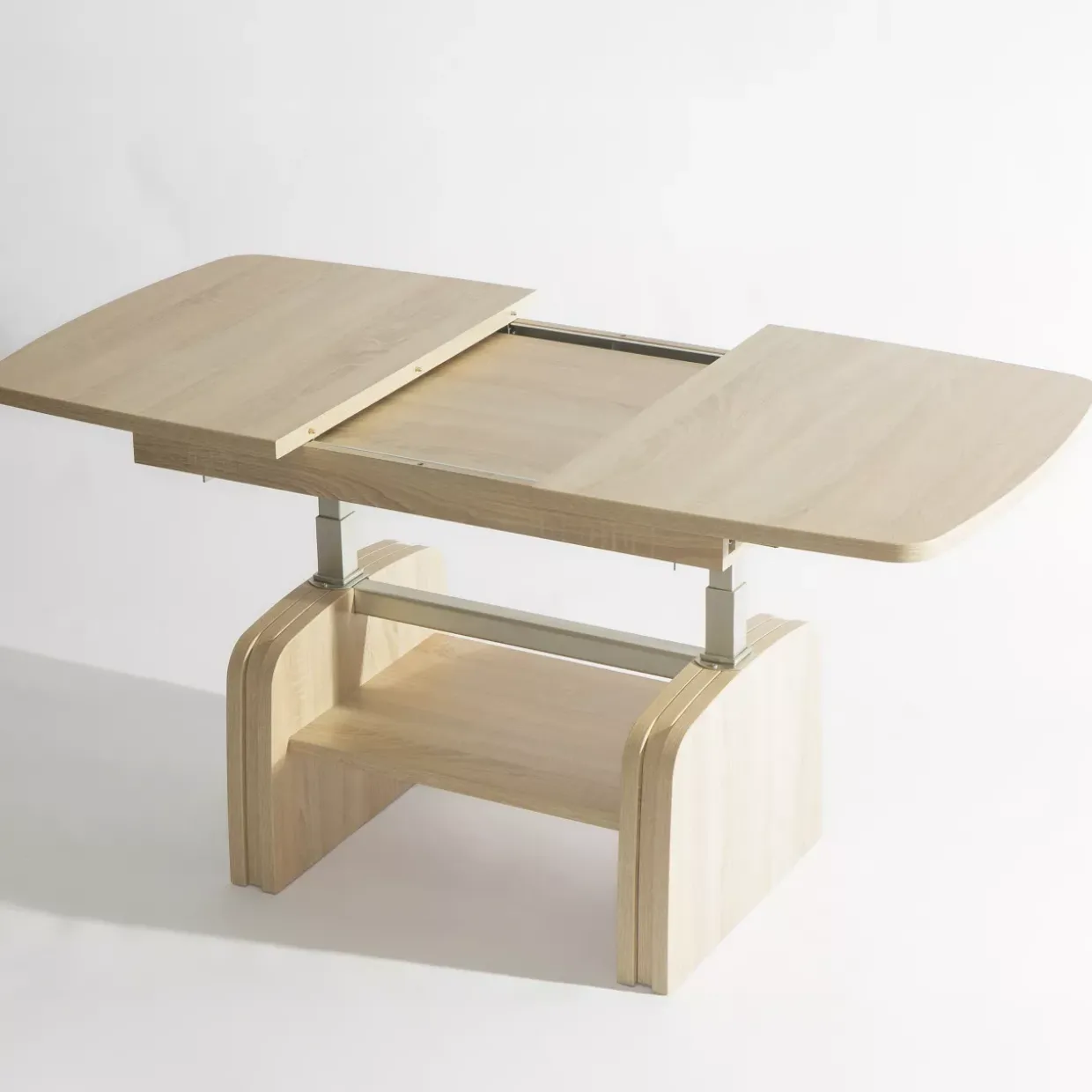 Eine Bereicherung für jedes moderne Wohnzimmer stellt der Couchtisch in Naturbuche Nachbildung dar. Seine klare Linienführung wird durch die zwei Säulen und den praktischen Ablageboden unterstrichen. Mit seiner rechteckigen Form fügt sich der Tisch nahtlos in verschiedene Einrichtungsstile ein und bietet gleichzeitig nützlichen Stauraum.Ein besonderes Highlight ist die Tischplatte, die seitlich gerundet ist und mit einer robusten 2 mm ABS-Kante versehen wurde. Diese Details verleihen dem Möbelstück nicht nur eine elegante Optik, sondern sorgen auch für zusätzliche Sicherheit und Langlebigkeit.Zusätzlich beeindruckt der Tisch durch seine Funktionalität: Dank eines Gashublifts kann die Höhe auf bis zu 71 cm verstellt werden. Diese Flexibilität ermöglicht es Ihnen, den Tisch je nach Bedarf und Situation optimal zu nutzen, sei es für ein gemütliches Abendessen oder als Arbeitstisch.Gefertigt aus Holzwerkstoff, vereint der Tisch natürliche Ästhetik mit moderner Verarbeitung. Die Naturbuche Nachbildung sorgt dabei für eine warme und einladende Atmosphäre. Erleben Sie, wie dieser Couchtisch Ihrer Einrichtung eine moderne Note verleiht und gleichzeitig durch seine durchdachten Funktionen überzeugt. Ein Möbelstück, das sowohl in Design als auch in Funktionalität höchsten Ansprüchen gerecht wird.