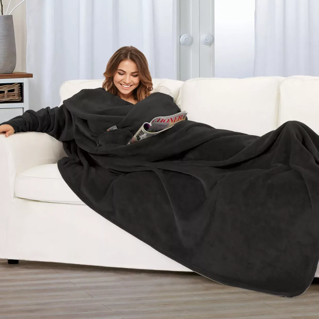 Ein Hauch von Eleganz in der Farbe Schwarz verschönert Ihre Abende auf der Couch. Die moderne, rechteckige Ärmeldecke im Premium-Modell bietet nicht nur stilvolles Design, sondern auch höchsten Komfort. Die hochwertige Microfaser aus Synthetikfaser umhüllt Sie das ganze Jahr über mit wohliger Wärme.
