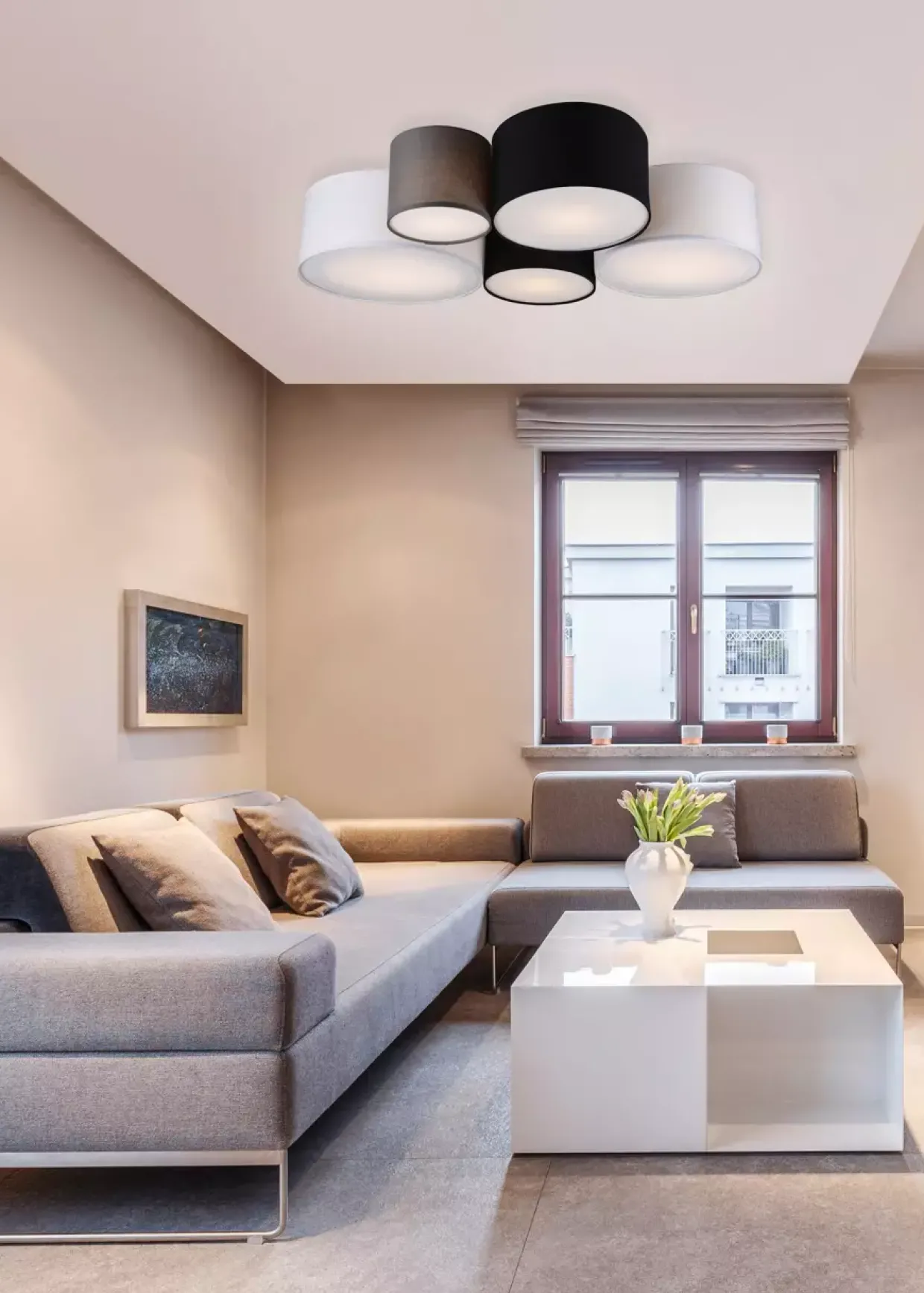 Stoffleuchten sorgen für eine gemütliche Atmosphäre und gelten als Klassiker der dekorativen Beleuchtung. Besonders im Wohn- und Schlafbereich kommt die fünfflammige Deckenleuchte gut zur Geltung. Sie spendet harmonische Lichtakzente und verleiht Ihrem Zuhause ein angenehmes Wohnklima. Zwei weiße, zwei schwarze und ein grauer Stoffschirm ergeben zusammen eine harmonische Kombination, die vielfältig verwendet werden kann. Für eine energiesparende Beleuchtung empfiehlt sich die Verwendung eines LED Leuchtmittels. Diese sind eine optimale Alternative zu herkömmlichen Halogen Leuchtmitteln und stehen für eine hohe Lichtqualität und eine Energieeinsparung von bis zu 80%. Zusätzlich profitieren Sie bei LED Leuchtmitteln von einer langen Lebensdauer, einer geringen Wärmeentwicklung und schonen gleichzeitig die Umwelt.