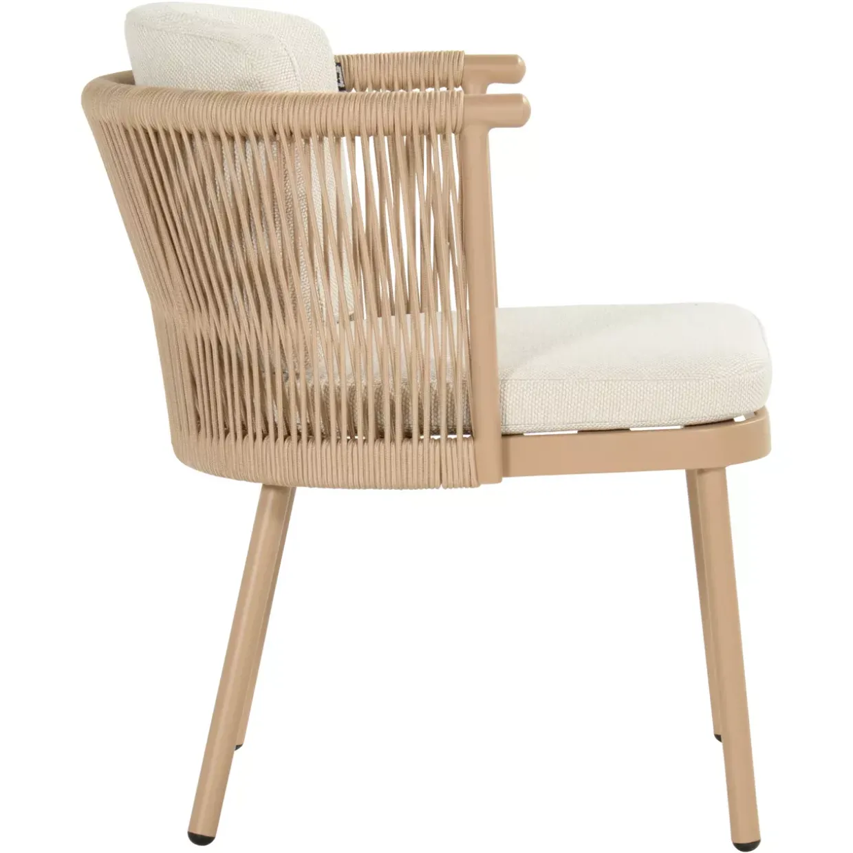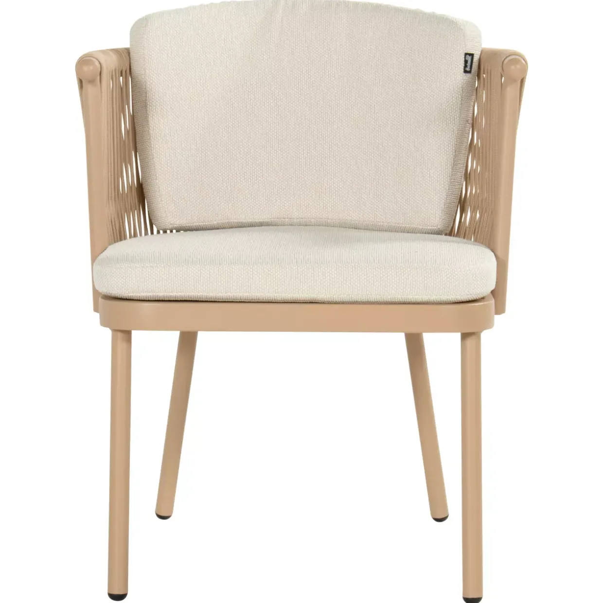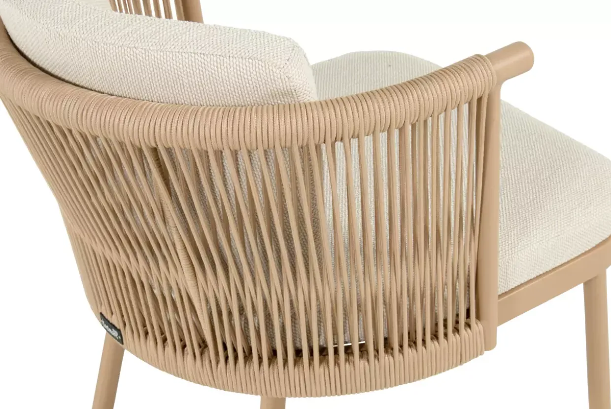 Der Toledo Dining Sessel vereint charmanten Cottage-Stil mit modernem Design. In warmen Brauntönen gehalten, fügt er sich harmonisch in jedes Ambiente ein. Der stabile Aluminiumrahmen sorgt für Langlebigkeit und Leichtigkeit, perfekt für vielfältige Einsatzmöglichkeiten. Ein 4-Fußgestell unterstreicht die solide Bauweise und gewährleistet stabilen Halt.Ein Highlight des Sessels ist die komfortable Rückenlehne aus Olefin Rope. Dieses Material ist bekannt für seine Widerstandsfähigkeit gegen Witterungseinflüsse und seine angenehme Haptik. Die Kombination aus Metall und Textil verleiht dem Möbelstück eine elegante Note, die sowohl optisch als auch funktional überzeugt.Besonders erwähnenswert sind die im Lieferumfang enthaltenen Kissen. Diese bieten zusätzlichen Komfort und sind ideal für lange Abende im Freien oder entspannte Stunden im Wohnbereich. Die Kissen harmonieren perfekt mit dem restlichen Design und runden das Gesamtbild ab.Ob im Garten, auf der Terrasse oder im Innenbereich – der Toledo Dining Sessel ist eine stilvolle Ergänzung für jeden Raum. Die Kombination aus hochwertigen Materialien und durchdachtem Design macht ihn zu einer ausgezeichneten Wahl für anspruchsvolle Nutzer, die Wert auf Qualität und Ästhetik legen.