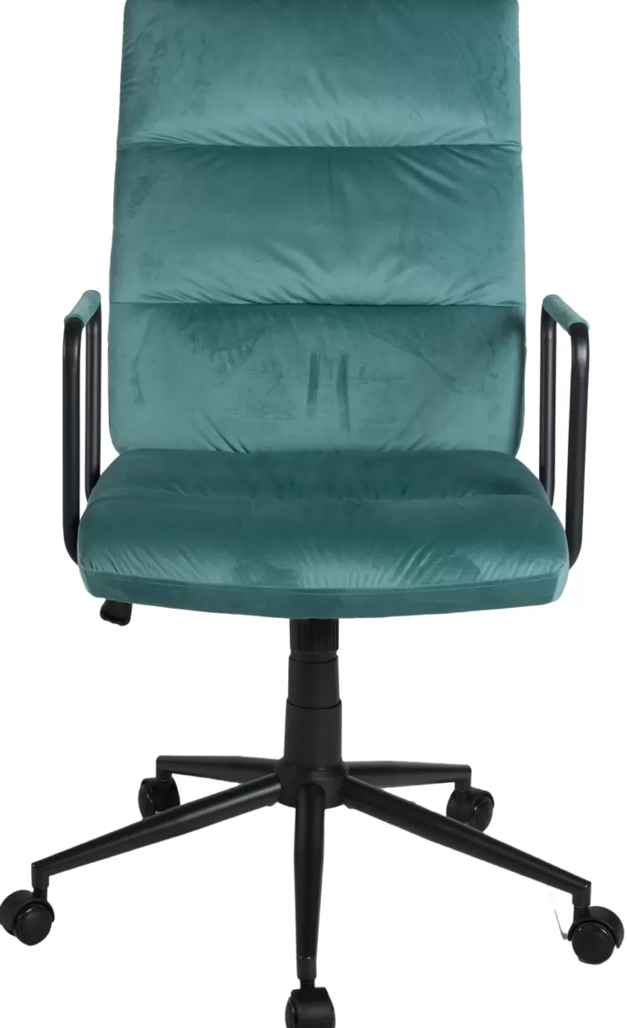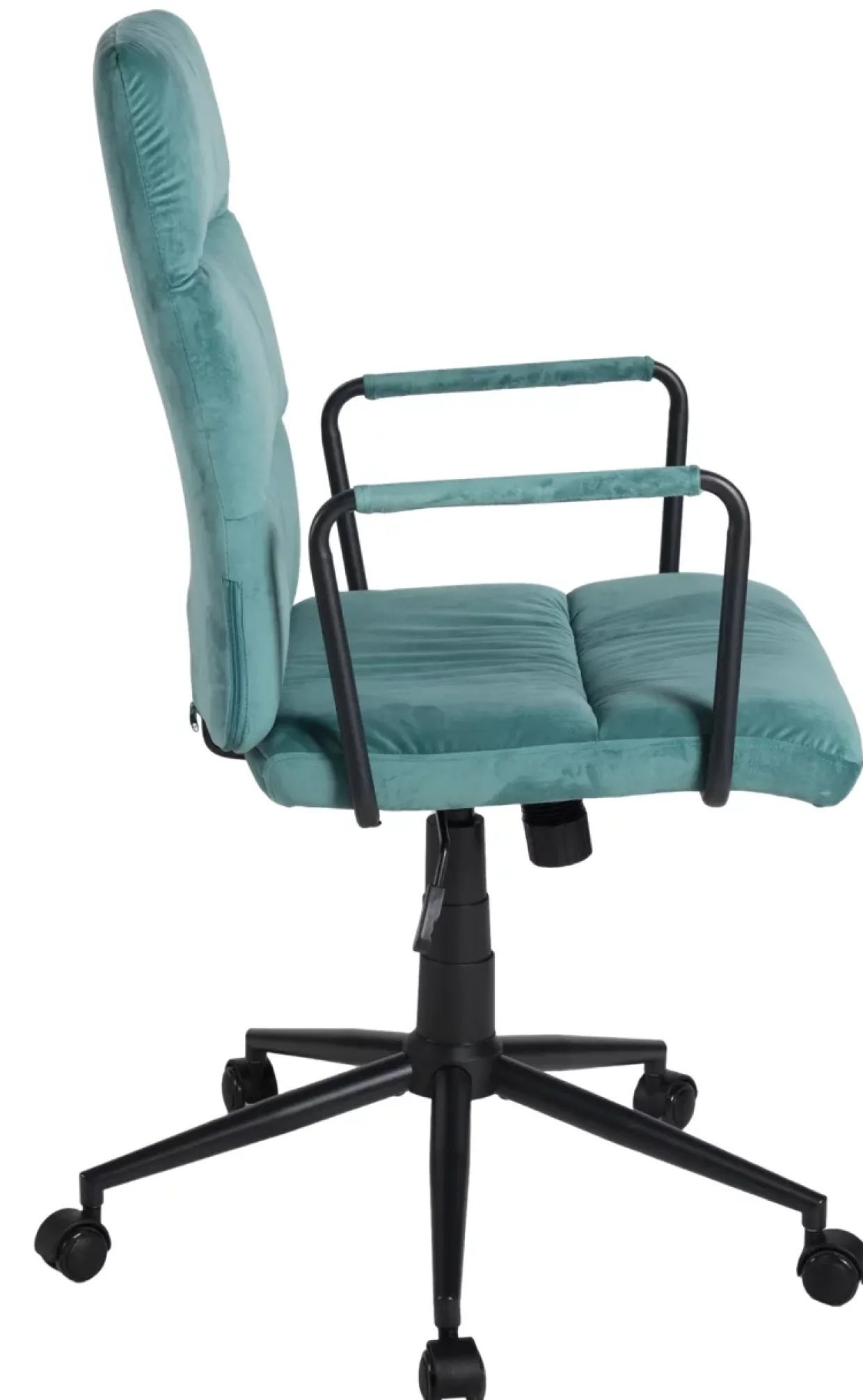 Ein Drehstuhl in Petrol mit Veloursbezug und einem schwarzen Metallfußkreuz vereint modernes Design mit einem Hauch von Luxus. Die Farbe Petrol, ein elegantes Mischung aus Blau und Grün, verleiht dem Stuhl eine ansprechende und zeitgemäße Ästhetik.