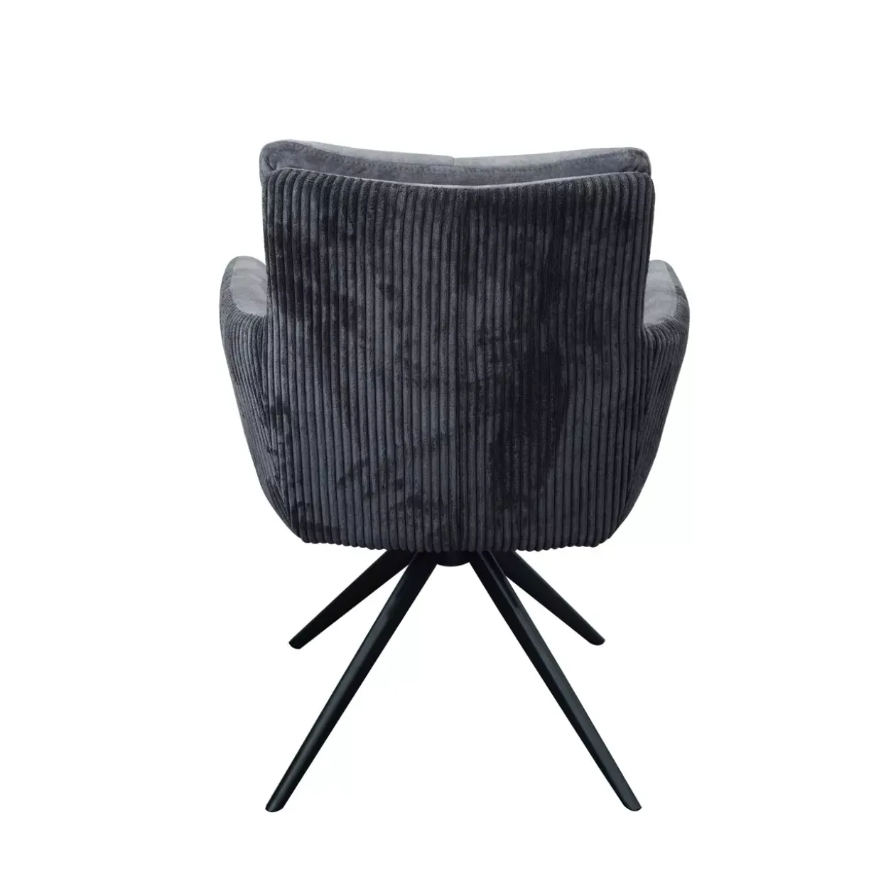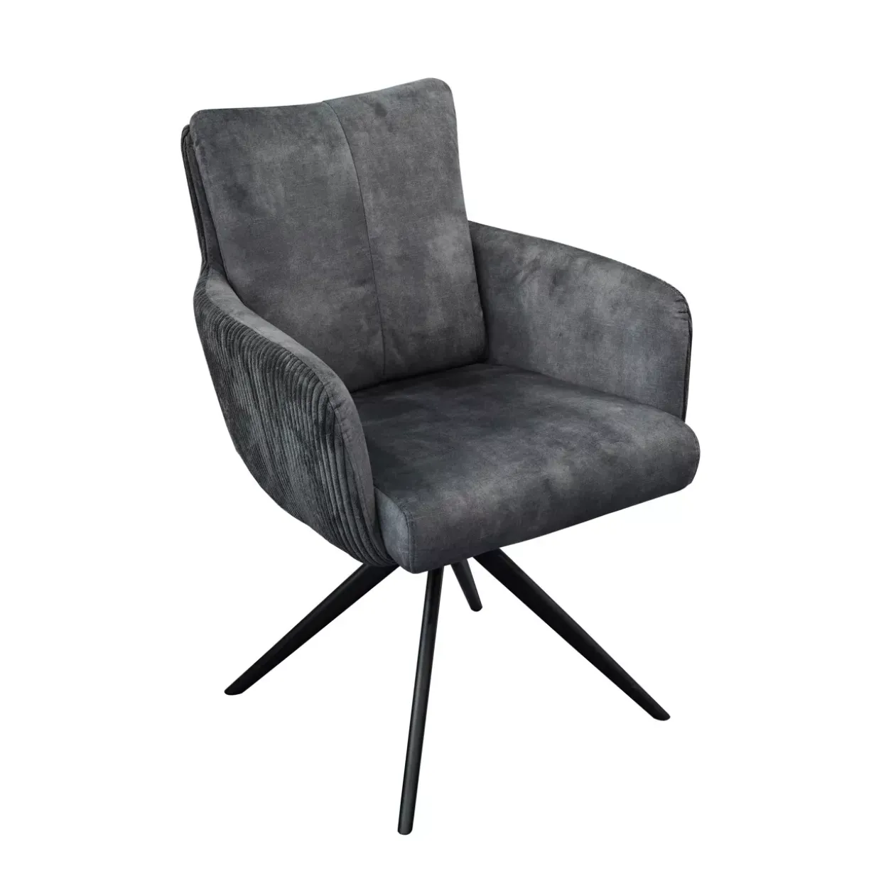Ein Hauch von Samt im Inneren und die elegante Cord-Optik außen verleihen diesem Drehstuhl einen modernen Charme. Die anthrazite Farbgebung fügt sich nahtlos in jedes zeitgemäße Interieur ein. Dank des 4-Fußgestells aus robustem Metall bietet der Stuhl nicht nur Stabilität, sondern auch eine ansprechende Ästhetik.