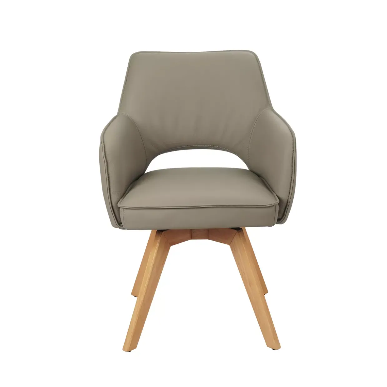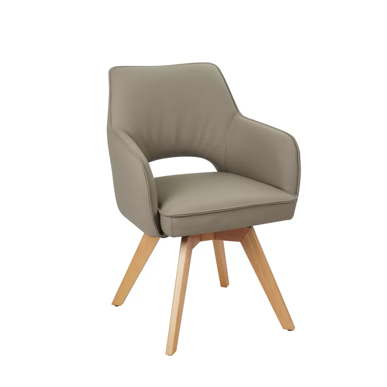 Ein Highlight des Tailfingen Drehstuhls ist die automatische Rückstellung, die für optimalen Komfort und Flexibilität sorgt. Dieser Stuhl vereint die Eleganz des Japandi-Stils mit der warmen, neutralen Farbe Taupe. Die Kombination aus hochwertigem Leder und edlem Holz verleiht dem Drehstuhl eine zeitlose Ästhetik, die sich nahtlos in jedes moderne Interieur einfügt.
