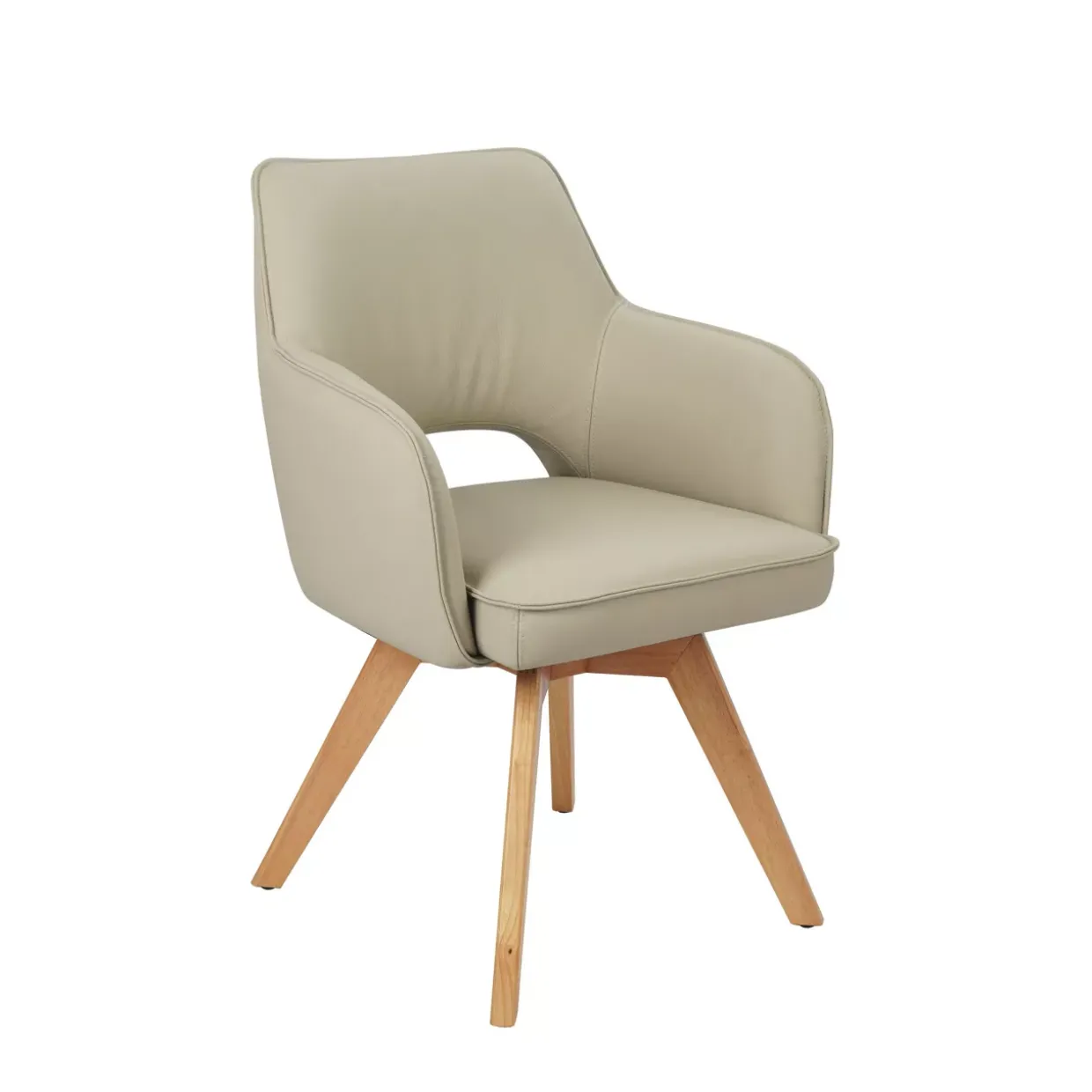 Mit einer automatischen Rückstellung ausgestattet, bietet der Tailfingen Drehstuhl ein Höchstmaß an Komfort und Bequemlichkeit. Die Verschmelzung von Leder und Holz verkörpert den eleganten Japandi-Stil, der Einfachheit und Funktionalität in den Vordergrund stellt. Der warme Beige-Ton fügt sich harmonisch in jede Umgebung ein und schafft eine beruhigende Atmosphäre.
