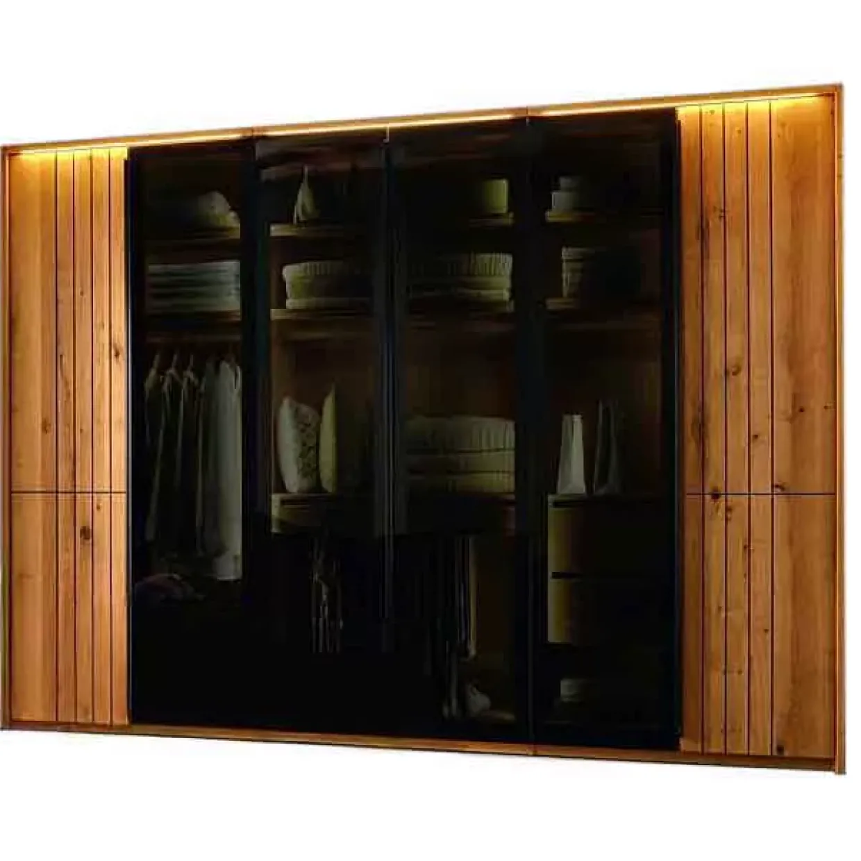 Erlesene Asteiche in Massivholz und ein moderner Stil vereinen sich in diesem eindrucksvollen Drehtürenschrank. Die Oberfläche, liebevoll geölt, verleiht dem Möbelstück eine natürliche und warme Ausstrahlung. Besonders hervorzuheben sind die zwei Türen in Rillenoptik, die aus Massivholz gefertigt sind und dem Schrank eine dynamische Textur verleihen. Ein faszinierendes Zusammenspiel von Materialien erwartet Sie: Holz, Glas und Metall harmonieren perfekt und sorgen für eine langlebige und elegante Konstruktion. Die vier Glastüren in dunkelgrau, die nicht vollständig blickdicht sind, bieten einen stilvollen Kontrast zum warmen Holzton der Asteiche. Der Drehtürenschrank ist nicht nur ein Blickfang, sondern auch funktional durchdacht. Passende Passepartoutrahmen und ein Beleuchtungsset sind auf Anfrage erhältlich und ergänzen das Gesamtbild gekonnt. Die Möglichkeit, ein Zubehörset zu integrieren, bietet zusätzlichen Komfort und Flexibilität für Ihre individuellen Bedürfnisse. Schwarz als Akzentfarbe verleiht dem Möbelstück einen modernen Touch und rundet das Design ab. Ob im Schlafzimmer oder im Wohnzimmer, dieser Schrank fügt sich mühelos in verschiedene Raumkonzepte ein und wird zu einem stilvollen Begleiter in Ihrem Zuhause.