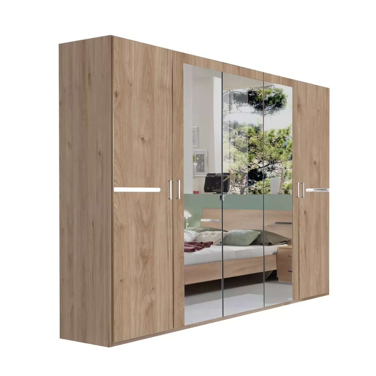Drehtürenschrank Anna beeindruckt mit seinem modernen Stil und einer eleganten Kombination aus Artisan Eiche Nachbildung und glänzenden Chrom-Applikationen. Diese gelungene Materialwahl verleiht jedem Raum eine zeitlose Eleganz. Besonders hervorzuheben sind die drei integrierten Spiegel, die nicht nur optisch vergrößern, sondern auch den Raum mit zusätzlichem Licht durchfluten.