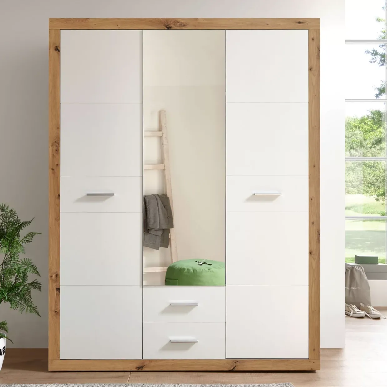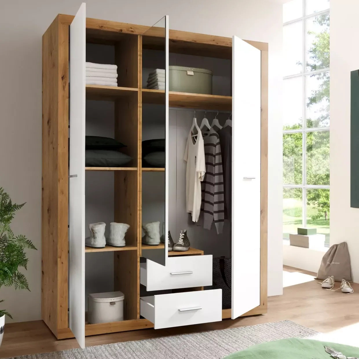 Artisan Eiche Nachbildung verleiht dem Drehtürenschrank Stone einen unverwechselbaren Charme im Cottage-Stil. Diese Kombination aus zeitlosem Design und natürlicher Eleganz schafft eine harmonische Atmosphäre in Ihrem Zuhause. Mit seiner Farbgebung in Weiß fügt sich der Schrank nahtlos in unterschiedlichste Einrichtungsstile ein, ohne dabei aufdringlich zu wirken.Der Stone Drehtürenschrank überzeugt durch seine klassische Türart: die Drehtür. Diese ermöglicht einen einfachen Zugang zum Innenraum und bietet gleichzeitig eine klare, strukturierte Optik. Das Material, ein hochwertiger Holzwerkstoff, garantiert Stabilität und Langlebigkeit, während es gleichzeitig eine umweltfreundliche Alternative zu Massivholz darstellt.Vielseitigkeit trifft auf Funktionalität. Der Schrank bietet ausreichend Stauraum für Kleidung, Bettwäsche oder andere wichtige Dinge des täglichen Lebens. Durch die durchdachte Innenaufteilung bleibt alles stets übersichtlich und griffbereit.In der Welt der Möbel ist der Drehtürenschrank im Modell Stone ein Paradebeispiel dafür, wie Design und Funktion Hand in Hand gehen können. Sein durchdachtes Konzept und die hochwertige Verarbeitung machen ihn zu einem verlässlichen Begleiter im Alltag. Die Wahl eines solchen Möbels zeugt von gutem Geschmack und einem Gespür für stilvolle Einrichtung.