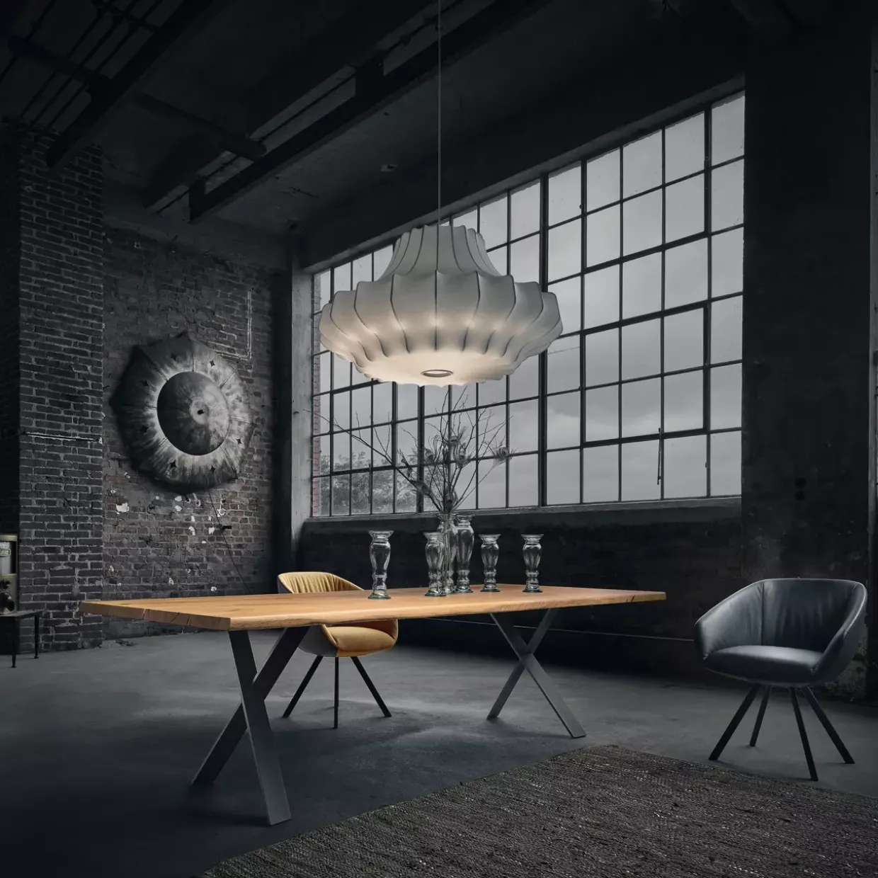 Das Zusammenspiel von Metall und Holz verleiht diesem Möbelstück eine zeitlose Ästhetik. Der Kreuzfuß sorgt nicht nur für Stabilität, sondern setzt auch einen markanten Akzent im Design. Die einzigartige Kombination aus Rissen, Ästen, Spalten und Löchern, die sorgfältig versiegelt sind, verleiht dem Tisch Charakter und Charme.
