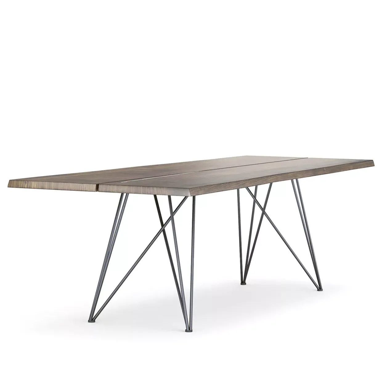 Besondere Aufmerksamkeit verdient die Tischplattenausführung mit geteiltem Holz, die durch eine natürliche Baumkante an den Längsseiten und eine Schrägkante an den Stirnseiten besticht. Solche Details machen den Tisch nicht nur zu einem funktionalen Möbelstück, sondern auch zu einem ästhetischen Highlight.
