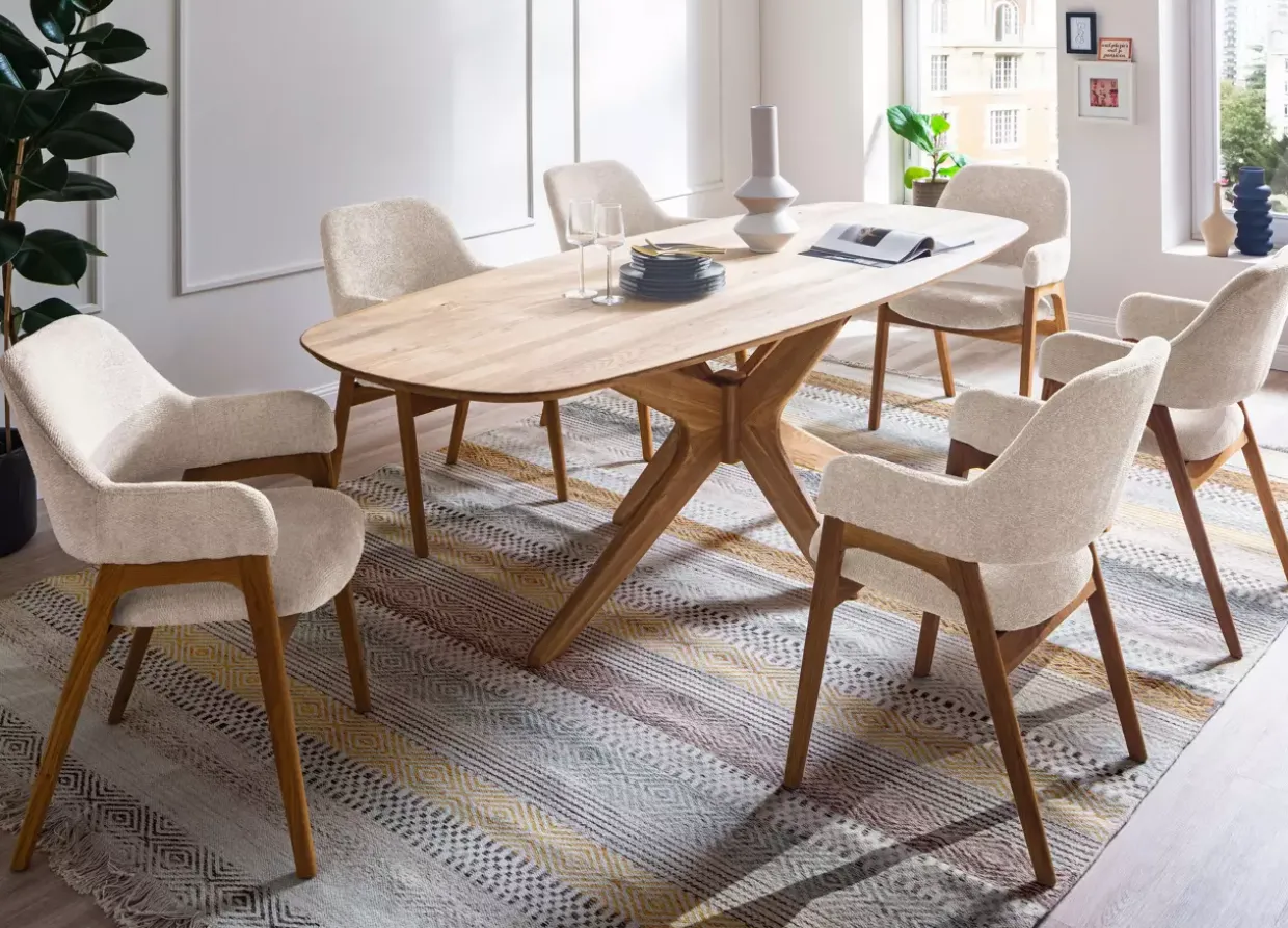 Die ovale Form des Jefferson Esstisches verleiht jedem Raum eine elegante und zugleich moderne Note. Im skandinavischen Stil gehalten, fügt sich dieser Tisch harmonisch in verschiedene Wohnkonzepte ein. Die natürliche Schönheit der Eiche, geölt in einem warmen Bianco-Ton, strahlt Ruhe und Beständigkeit aus. Ein besonderes Highlight ist die schweizer Kante, die dem Tisch eine raffinierte Leichtigkeit verleiht und das zeitlose Design unterstreicht.