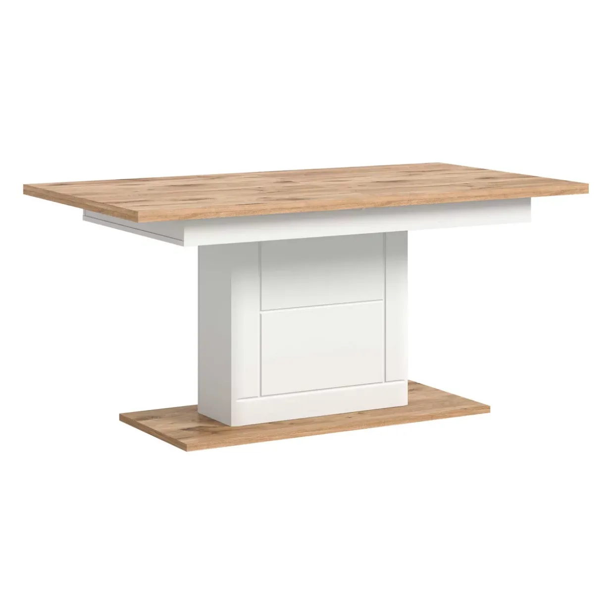 Der ausziehbare Esstisch besticht nicht nur durch seine optischen Merkmale, sondern auch durch seine funktionalen Vorteile. Dank der Säulenfußform bietet er eine stabile Basis, die gleichzeitig ausreichend Beinfreiheit gewährleistet. Gefertigt aus hochwertigem Holzwerkstoff, garantiert dieser Tisch eine langlebige und robuste Nutzung, die Sie bei jedem Familienessen oder geselligen Beisammensein überzeugen wird. Der Ausziehmechanismus ermöglicht es Ihnen, den Tisch im Handumdrehen zu vergrößern, sodass Sie stets flexibel auf spontane Gäste oder besondere Anlässe vorbereitet sind.