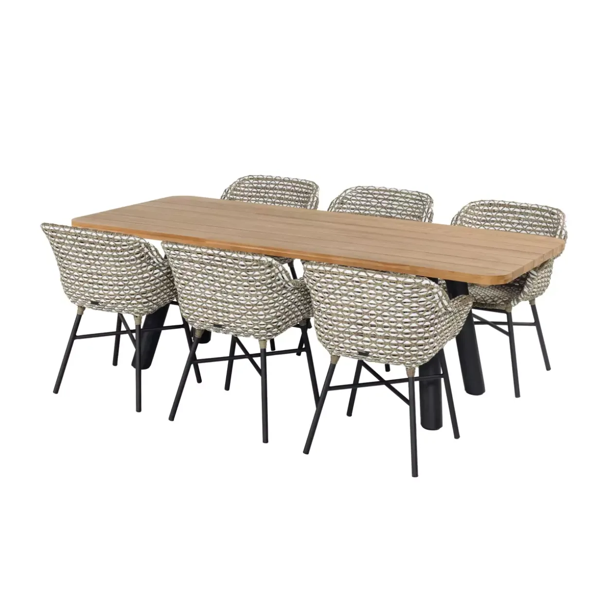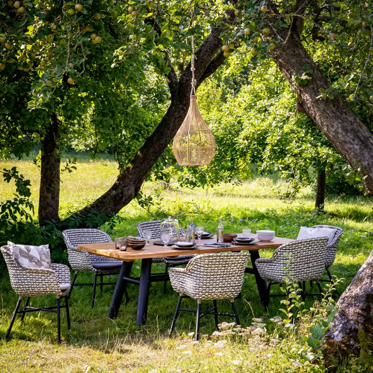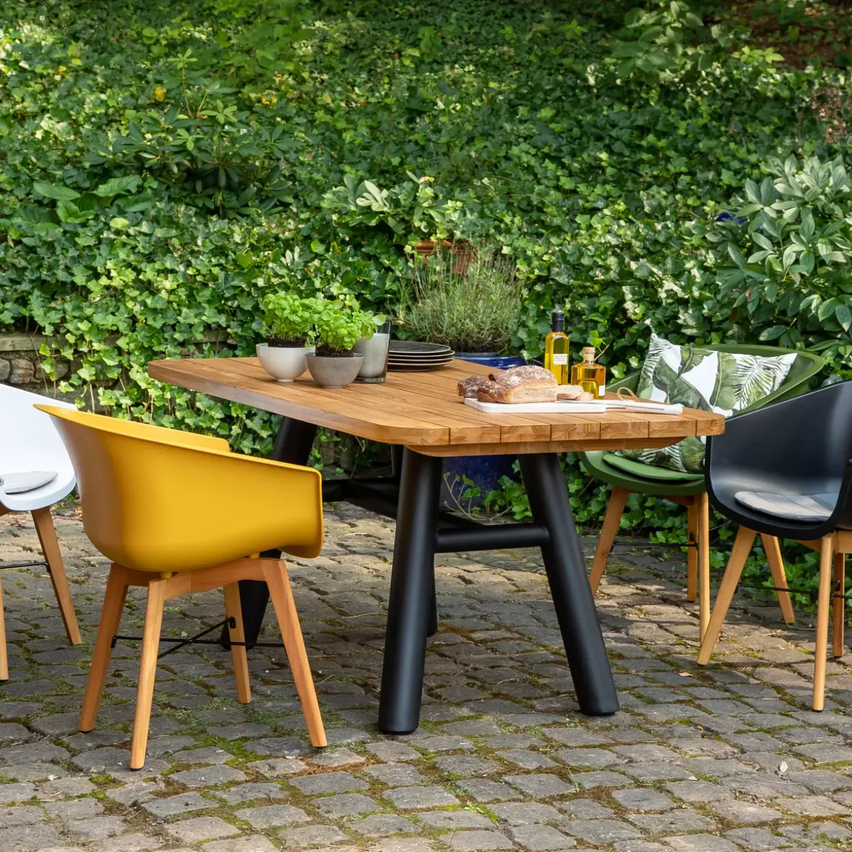 Zeitlose Eleganz trifft auf modernes Design, wenn der rechteckige Gartentisch Saba in Ihrem Außenbereich Platz findet. Gefertigt aus edlem Teakholz, vereint er natürliche Schönheit mit robuster Langlebigkeit. Das stilvolle 4-Fußgestell verleiht dem Tisch Stabilität und fügt sich harmonisch in moderne Außenbereiche ein.Der Mix aus Holz und Metall sorgt für eine ansprechende Materialkombination. Aluminium, bekannt für seine Leichtigkeit und Korrosionsbeständigkeit, ergänzt das Teakholz perfekt und macht den Tisch nicht nur widerstandsfähig, sondern auch pflegeleicht. Mit seiner schwarz-ästhetischen Oberfläche bietet der Tisch einen eleganten Kontrast zur natürlichen Holzfarbe und bringt zeitgenössischen Chic in Ihren Garten.Ein Gartentisch wie Saba ist mehr als nur ein Möbelstück. Er wird zum Mittelpunkt geselliger Runden und gemütlicher Stunden im Freien. Die rechteckige Form bietet genügend Platz für Familie und Freunde, um gemeinsam zu speisen, zu lachen und das Leben zu genießen. Egal, ob für ein festliches Dinner oder ein entspanntes Frühstück im Freien, dieser Tisch ist die perfekte Ergänzung für jeden Garten oder jede Terrasse.Lassen Sie sich von der Kombination aus Funktionalität und Ästhetik faszinieren und verwandeln Sie Ihren Außenbereich in eine stilvolle Oase der Entspannung.