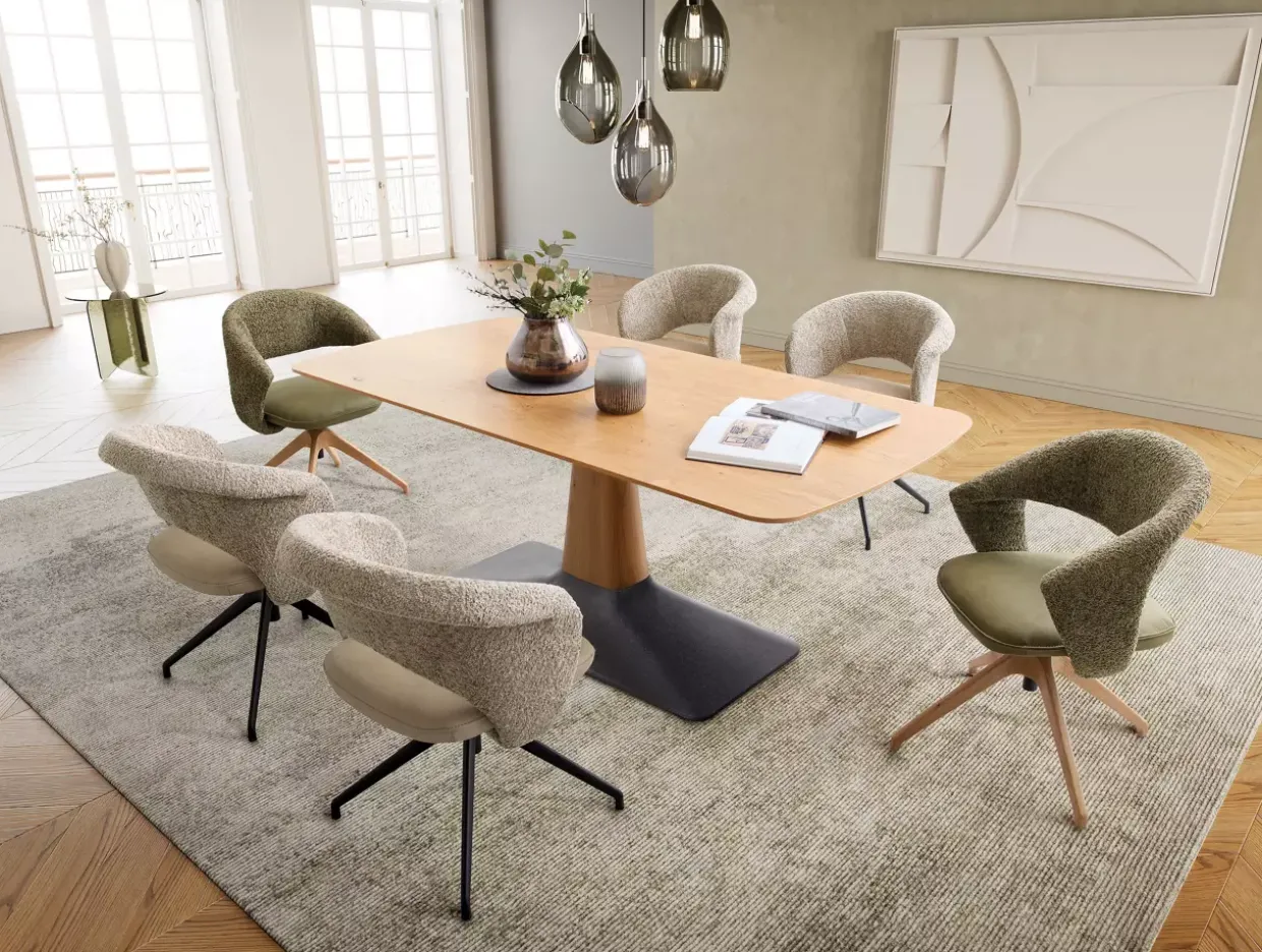 Dieser Esstisch vereint Funktionalität mit ästhetischem Design und passt sich mühelos verschiedenen Wohnkonzepten an. Die Wahl der Materialien und Farben spiegelt einen modernen Stil wider, der sowohl für den täglichen Gebrauch als auch für besondere Anlässe geeignet ist. Lassen Sie sich von der harmonischen Verbindung aus Naturmaterialien und zeitgemäßer Gestaltung inspirieren und genießen Sie die einladende Atmosphäre, die dieser Tisch in Ihr Zuhause bringt.