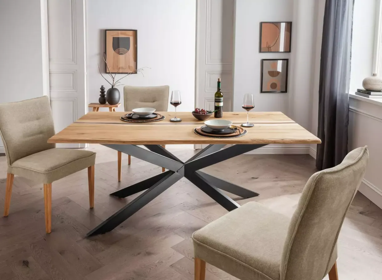 Ein weiteres hervorstechendes Merkmal ist der Sternfuß aus Metall, der dem Tisch nicht nur Stabilität, sondern auch ein modernes Flair verleiht. Die pulverbeschichtete Oberfläche des Metalls gewährleistet eine langlebige Nutzung und einen edlen Look. In der Kombination von Holz und Metall entsteht ein spannendes Zusammenspiel der Materialien, das sowohl robust als auch ästhetisch ansprechend ist.