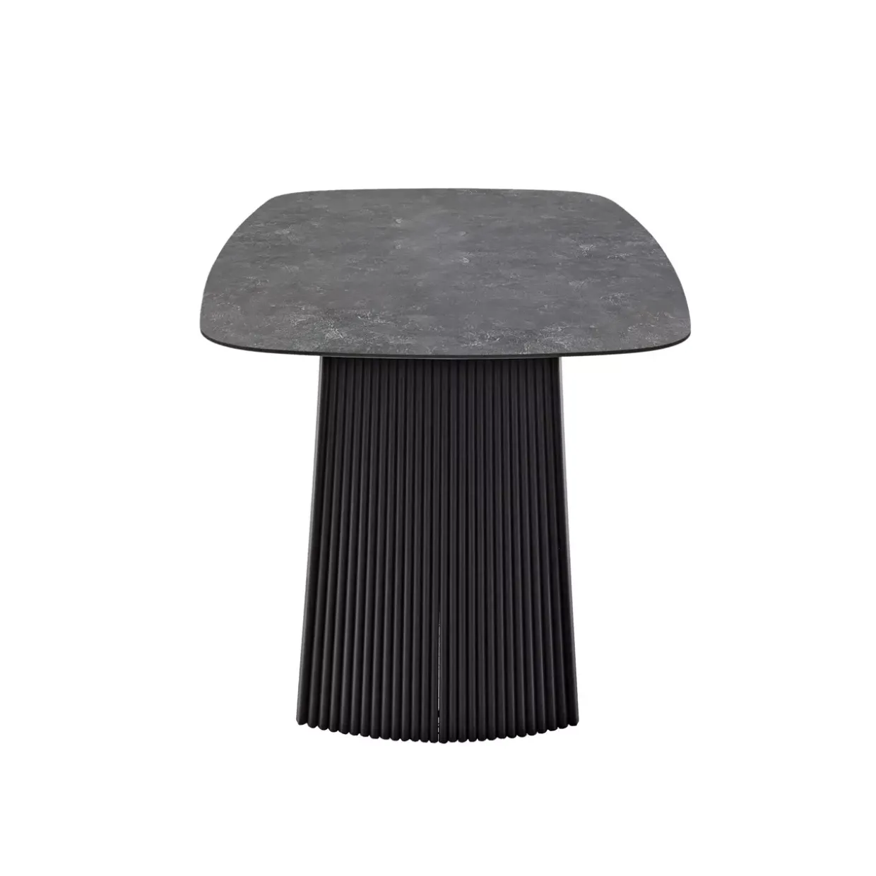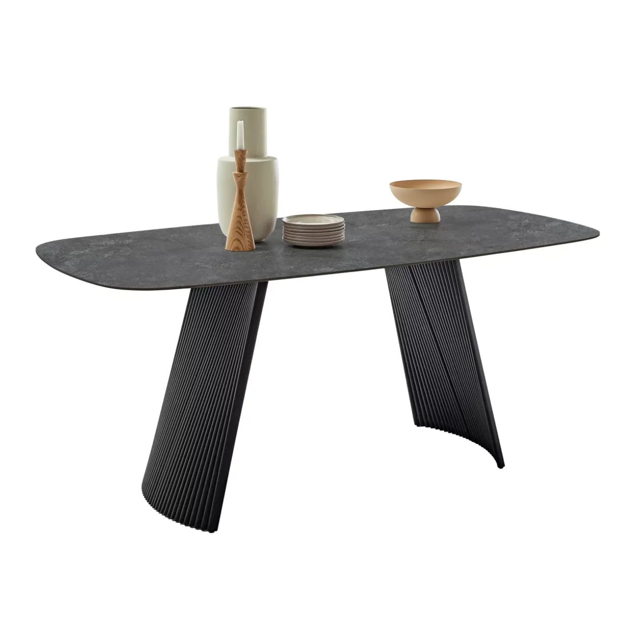 Keramik als Highlight prägt den Tobelo Esstisch und verleiht ihm eine zeitlose Eleganz. Mit einem Durchmesser von 11 mm beeindruckt die Keramikoberfläche durch ihre Robustheit und Widerstandsfähigkeit. Der moderne Stil des Tisches fügt sich harmonisch in verschiedene Wohnkonzepte ein und bietet eine perfekte Balance zwischen Funktionalität und Ästhetik.Vielseitigkeit zeigt sich in der Farbauswahl. Schwarz und Weiß schaffen sowohl Kontraste als auch harmonische Übergänge, je nach Vorliebe und Raumgestaltung. Diese Farbpalette ermöglicht es, den Tisch sowohl in minimalistisch gehaltenen als auch in opulenteren Räumen zu platzieren.Metall als Materialgrundlage verspricht Stabilität und Langlebigkeit. Die Kombination aus Metall und Keramik ergibt nicht nur ein modernes, sondern auch ein pflegeleichtes Möbelstück. Der Esstisch ist somit nicht nur ein optischer Hingucker, sondern auch ein praktischer Begleiter im Alltag.Einzigartige Details und hochwertige Materialien machen diesen Esstisch zu einem unverzichtbaren Bestandteil jedes modernen Essbereichs. Die klare Formensprache und das Zusammenspiel der Materialien schaffen eine Atmosphäre, die sowohl für gesellige Zusammenkünfte als auch für gemütliche Abendessen mit der Familie geeignet ist. Erleben Sie die perfekte Symbiose aus Design und Funktionalität in Ihrem Zuhause.