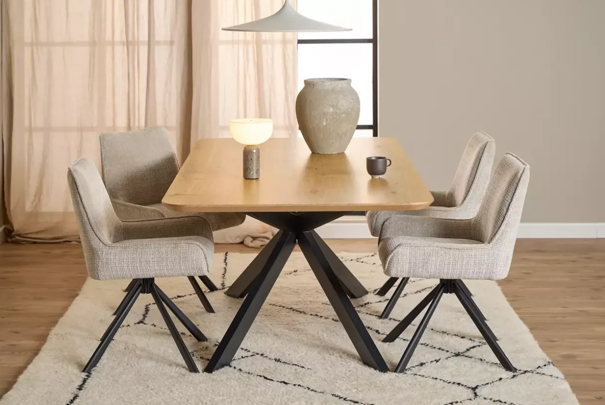 Die Wahl der Materialien, Stoff und Metall, steht für Qualität und Beständigkeit. Der Stoffbezug ist angenehm im Griff und pflegeleicht, während die Metallstruktur für Robustheit sorgt. Ein Esszimmerstuhl, der nicht nur durch Design besticht, sondern auch durch seine Funktionalität überzeugt.