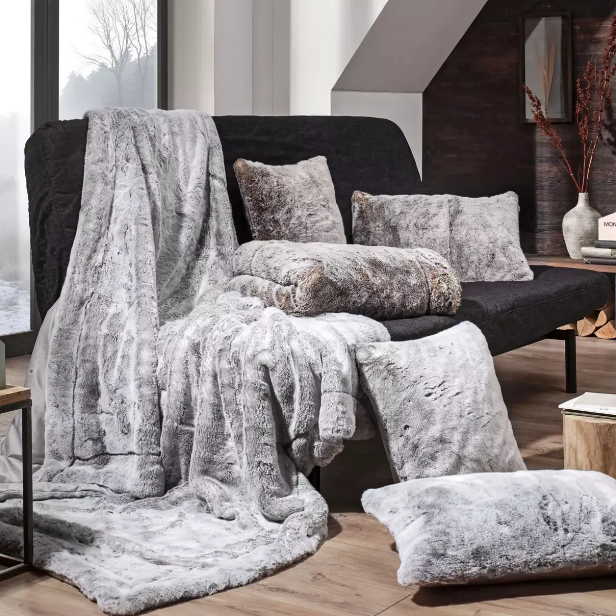 40×60 cm – silber -; Vorderseite: 800 gsm Acryl-Fellimitat; Rückseite: 200 gsm Micromink; Füllung: 450 g Polyester