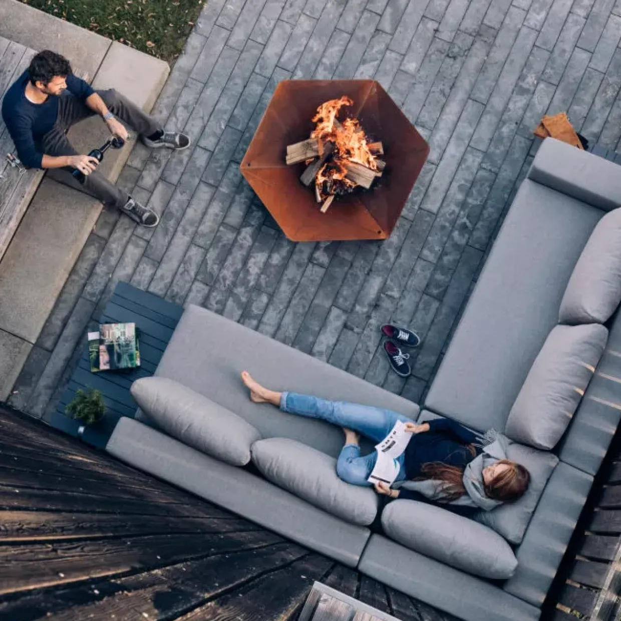 Corten-Stahl verleiht dieser Feuerschale ihr unverwechselbares Erscheinungsbild. Im Laufe der Zeit entwickelt sich auf der Oberfläche eine lebendige und einzigartige Rostpatina, die jeder Feuerschale eine persönliche Note verleiht. Neben der visuellen Attraktivität bietet das Modell Triple auch praktische Vorteile. Die Feuerschale ist einfach zerlegbar, was den Transport und die Lagerung erleichtert.