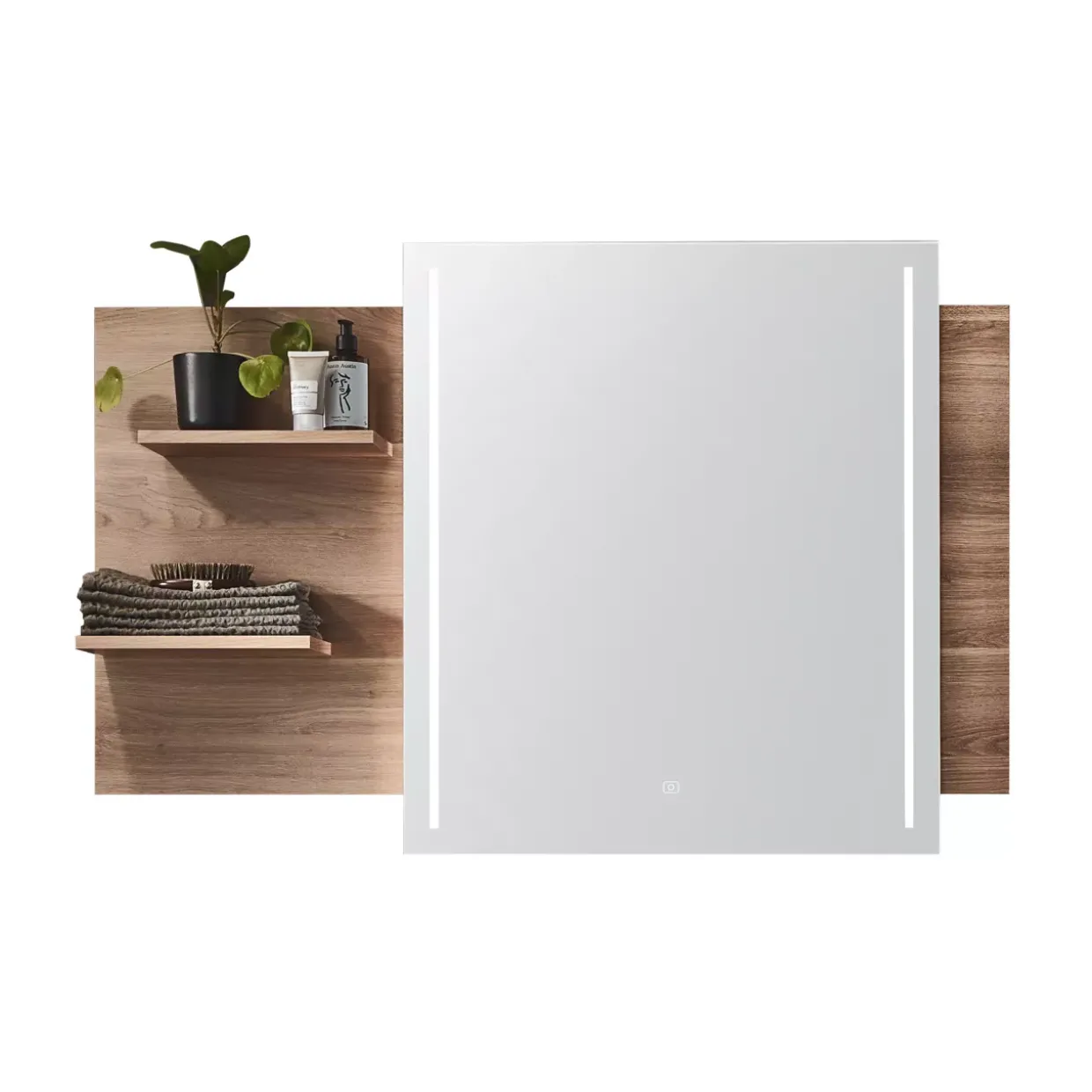 inkl. Touch LED Dimer Spiegelbreite 70 cm LED Streifen 2 Senkrecht links und rechts 36 Watt Ablagefächer links Farbton: Front Spiegel / Front Cuneo Eiche braun Größe: Breite 120 cm Stil: Modern bestehend aus: 1 Flächenspiegel Material: Korpus Holzwerkstoff / Front Glas Highlights