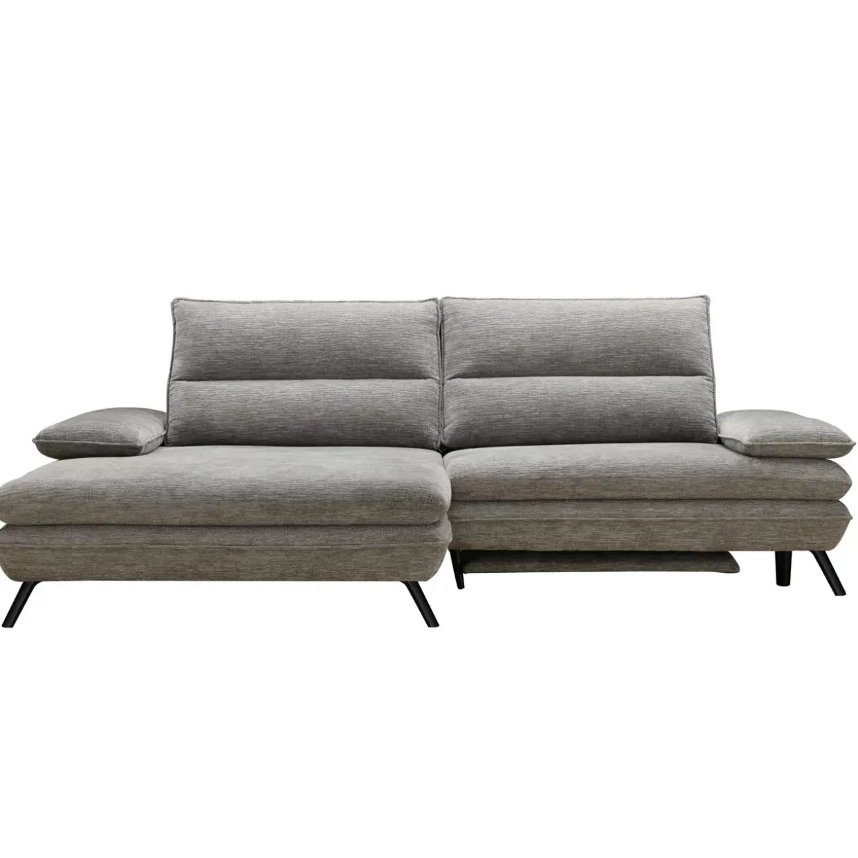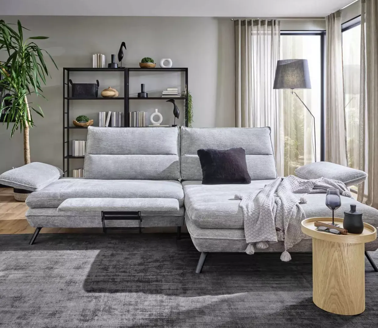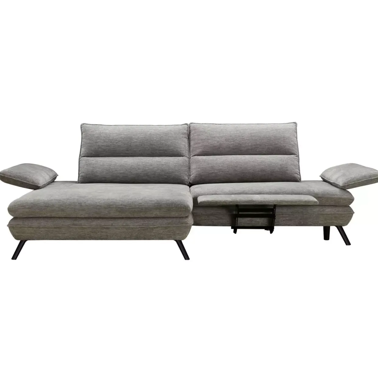 Ein Hauch von Eleganz durchzieht Ihr Wohnzimmer mit diesem Ecksofa in F-A Hellgrau. Das Zusammenspiel von Textil, Holz, Holzwerkstoff und Metall verleiht dem Möbelstück nicht nur eine beeindruckende Optik, sondern auch eine bemerkenswerte Stabilität. Komfort steht im Vordergrund: Die Armteilverstellung sowohl links als auch rechts ermöglicht eine individuelle Anpassung an Ihre Bedürfnisse. Mit der integrierten elektrischen Fußstütze erleben Sie ein unvergleichliches Entspannungserlebnis. Die Relax-Rückenlehne, die manuell über die Push-Back-Funktion bedient werden kann, ergänzt dieses Wohlfühlambiente, indem sie Ihnen die Möglichkeit bietet, den Rückenbereich nach persönlichen Vorlieben zu justieren. Der Echtbezug an der Rückseite des Sofas sorgt nicht nur für eine hochwertige Anmutung, sondern unterstreicht auch die Langlebigkeit des Möbelstücks. Diese Kombination aus Funktionalität und stilvollem Design macht das Ecksofa zu einem idealen Begleiter in Ihrem Zuhause. Ein stilvolles Möbelstück, das sich nahtlos in Ihr Interieur einfügt und gleichzeitig höchsten Komfort bietet – dieses Ecksofa ist die perfekte Wahl für all jene, die sowohl Design als auch Funktionalität schätzen. Gönnen Sie sich den Luxus und die Vielseitigkeit, die dieses Sofa bietet.