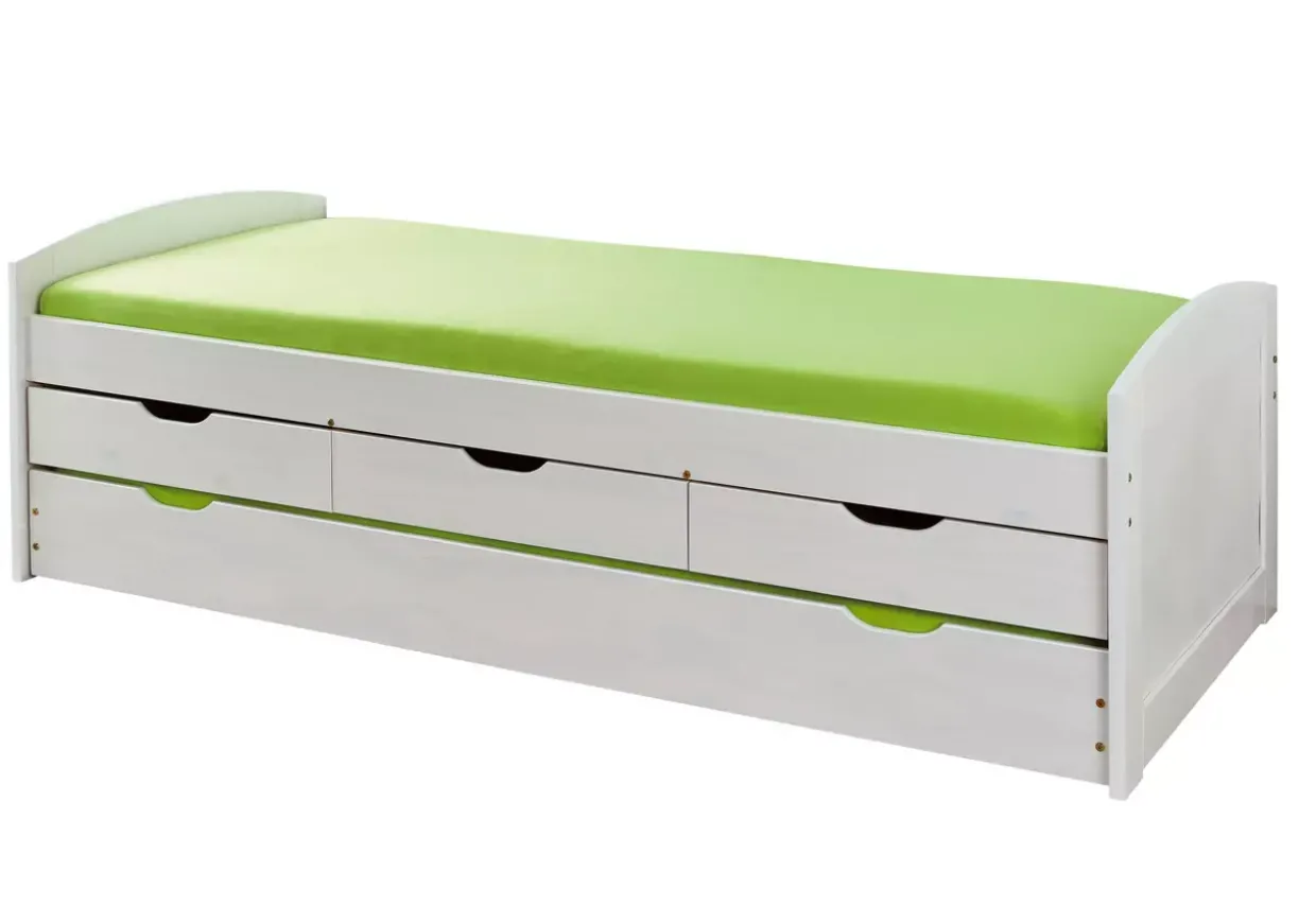 Drei geräumige Schubladen bieten zusätzlichen Stauraum und tragen zur Ordnung bei. Der integrierte Lattenrost sorgt für optimalen Schlafkomfort, sowohl für die Hauptmatratze mit den Maßen 90×200 cm als auch für die ausziehbare Liege mit einer 90×190 cm Matratze. So wird aus einem Einzelbett im Handumdrehen ein komfortabler Schlafplatz für Gäste.
