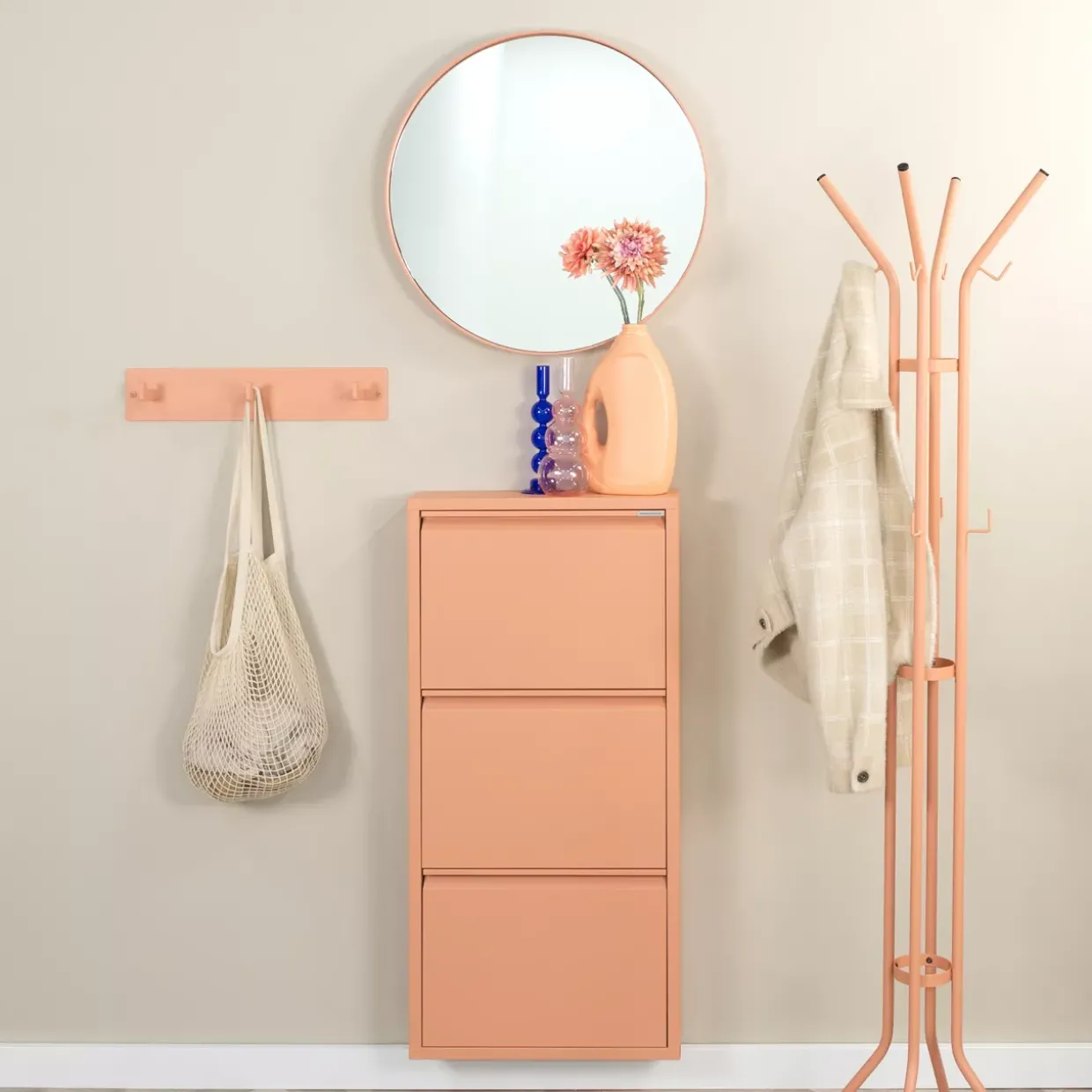 In einem warmen Ton von Clay Terra präsentiert sich diese Garderobe als stilvoller Blickfang in Ihrem Zuhause. Diese moderne Garderobe kombiniert Ästhetik und Funktionalität auf harmonische Weise. Gefertigt aus robustem Stahl, bietet sie nicht nur Stabilität, sondern auch eine langlebige Lösung für Ihre Aufbewahrungsbedürfnisse.Die moderne Formensprache dieser Garderobe fügt sich nahtlos in verschiedene Einrichtungsstile ein und verleiht jedem Raum eine zeitgemäße Note. Ob im Flur, im Schlafzimmer oder im Ankleidezimmer – die Garderobe bietet Platz für Ihre Kleidung und Accessoires, sodass alles stets griffbereit ist.Mit einer Anzahl von drei Einheiten pro Set ermöglicht diese Garderobe eine vielseitige Nutzung. Die sorgfältige Verarbeitung des Metalls unterstreicht den Anspruch an Qualität und Langlebigkeit. Stahl als Materialwahl sorgt nicht nur für Stabilität, sondern verleiht der Garderobe auch einen eleganten und zugleich industriellen Look.Für alle, die Wert auf hochwertige Materialien und modernes Design legen, ist diese Garderobe die ideale Wahl. Sie bietet nicht nur Platz für Jacken und Mäntel, sondern wird auch zum stilvollen Element Ihrer Einrichtung. Entdecken Sie die perfekte Symbiose aus Funktionalität und Design und lassen Sie sich von der Vielseitigkeit dieser Garderobe begeistern.