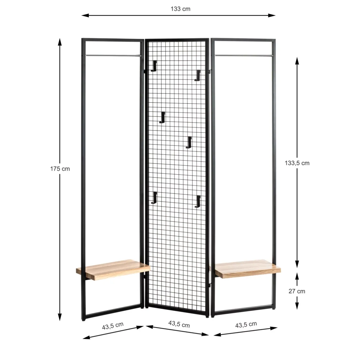 Harmonisch fügt sich das Zusammenspiel von schwarzen und eichefarbenen Elementen in verschiedene Wohnumgebungen ein. Dabei sorgt der Stahl, der für die Metallteile verwendet wird, nicht nur für eine solide Konstruktion, sondern auch für eine ansprechende Optik. Die Garderobe bietet genügend Raum, um Mäntel, Jacken und Accessoires stilvoll zu organisieren.