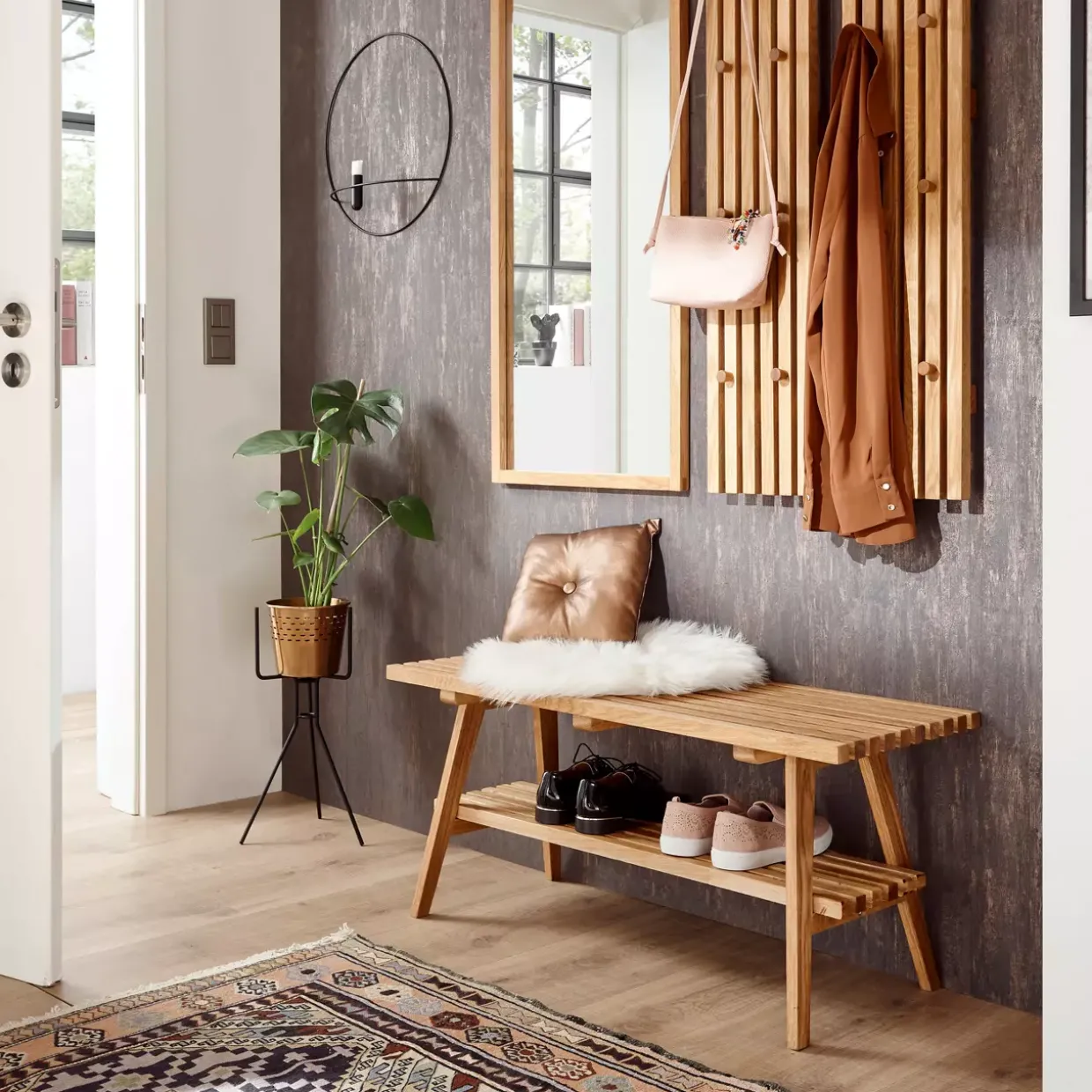 Die Garderobenbank „Alwar“ im beliebten skandinavischen Look lässt Ihren Eingangsbereich besonders gemütlich und einladend wirken. Die schmalen Holzbalken aus Eiche massiv geölt treffen genau den Zeitgeist des angesagten Scandi chic. Die praktische Sitz- und Ablageflächen machen die Bank zu einem vielseitigen und funktionellen Möbelstück.Eiche natur verleiht jedem Raum eine zeitlose Eleganz. Die Garderobenbank Alwar verkörpert diesen klassischen Stil in Perfektion. Mit ihrer natürlichen Holzmaserung und der geölten Oberfläche strahlt sie eine warme und einladende Atmosphäre aus. Die Wahl der Holzart ist entscheidend für die Langlebigkeit und Stabilität eines Möbelstücks. Eiche ist bekannt für ihre Robustheit und Beständigkeit, was diese Garderobenbank zu einer wertvollen Investition für Ihr Zuhause macht. Zwei Stück dieses Modells bieten nicht nur ausreichend Sitzgelegenheit, sondern auch eine harmonische Ergänzung für jeden Eingangsbereich.Eine Garderobenbank sollte nicht nur funktional sein, sondern auch ästhetisch ansprechend. Das Modell Alwar verbindet beides auf eindrucksvolle Weise. Sein konventionelles Design passt sich mühelos verschiedenen Einrichtungsstilen an und bietet gleichzeitig praktischen Nutzen. Ob zum Anziehen von Schuhen oder als Abstellfläche für Taschen, dieser Alleskönner erfüllt vielfältige Bedürfnisse.Die geölte Oberfläche sorgt dafür, dass das Holz atmen kann und seine natürliche Schönheit über Jahre hinweg bewahrt bleibt. Dies macht die Pflege einfach und unkompliziert. Eine Garderobenbank wie Alwar ist nicht nur ein Möbelstück, sondern ein Statement für Qualität und Stilbewusstsein.