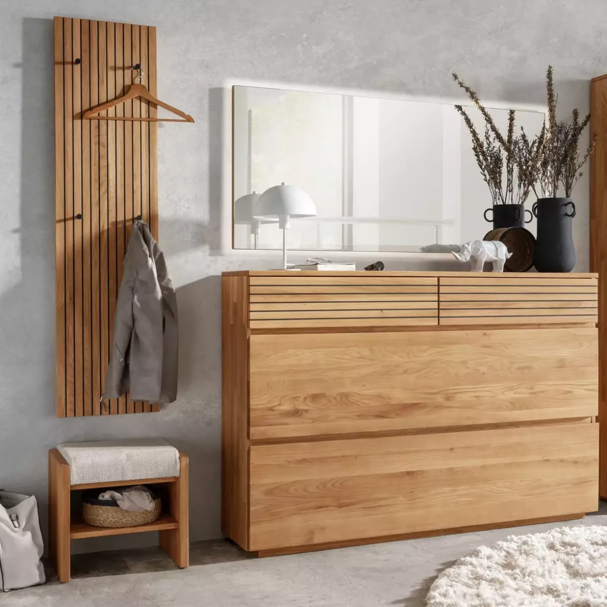 Asteiche massiv geölt – eine Hommage an die Schönheit der Natur. Diese Garderobenbank besticht durch ihre moderne Eleganz und die warme Ausstrahlung eichefarbenen Holzes. Ganzjährig passend, fügt sie sich harmonisch in verschiedene Wohnstile ein und bietet eine praktische Sitzgelegenheit im Eingangsbereich.