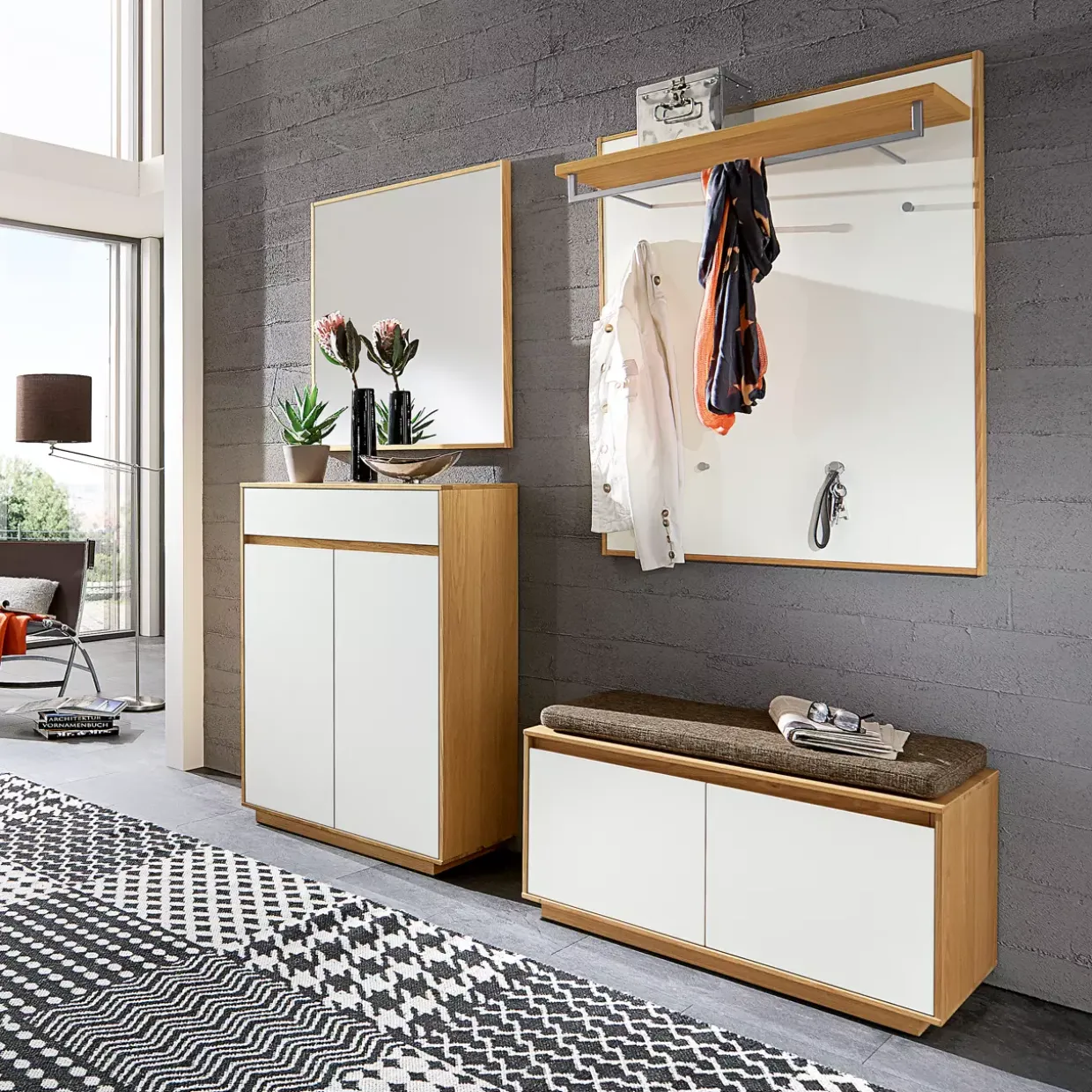 Die Garderobe ist der zentrale Anlaufpunkt in jedem Zuhause, egal ob Aufbruch oder Heimkehr. Die praktische Garderobenbank bietet Stauraum und Sitzgelegenheit in einem. Die klare Formensprache und durchdachte Funktionen bieten vielfältige Möglichkeiten bei der Gestaltung der Wunschgarderobe auch in kleinen Räumen. Weniger ist hier mehr, denn „V100“ präsentiert sich grifflos mit wertigem Korpus Eiche bianco teilmassiv und eleganter Lackfront weiß.