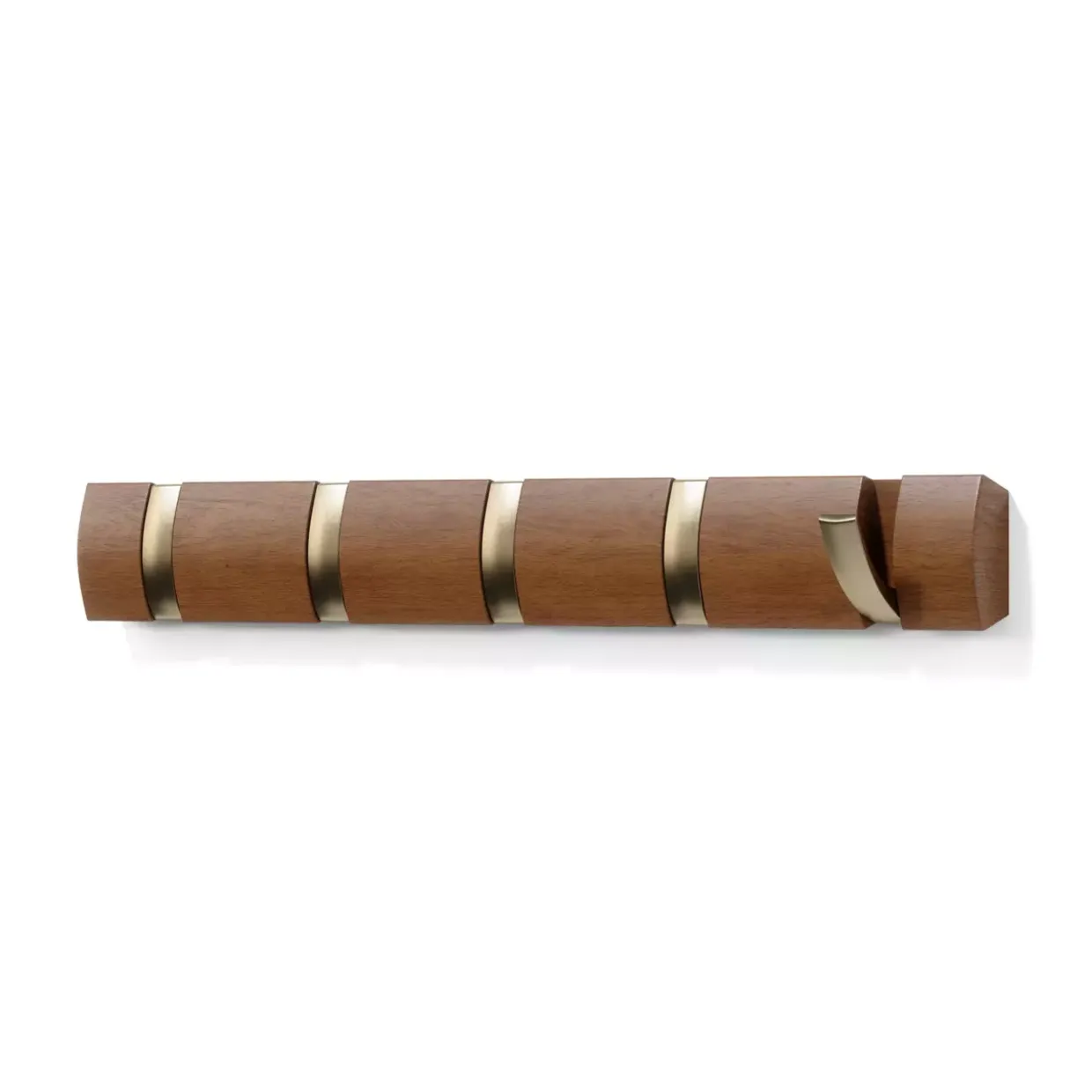 Holz in Kombination mit goldfarbenen Akzenten verleiht der Garderobenleiste einen Hauch von Raffinesse. Diese moderne Stilrichtung fügt sich nahtlos in verschiedenste Einrichtungsstile ein und bietet dabei sowohl Funktionalität als auch Ästhetik. Aus hochwertigem Holz gefertigt, besticht die Garderobenleiste durch ihre natürliche Eleganz und Langlebigkeit.