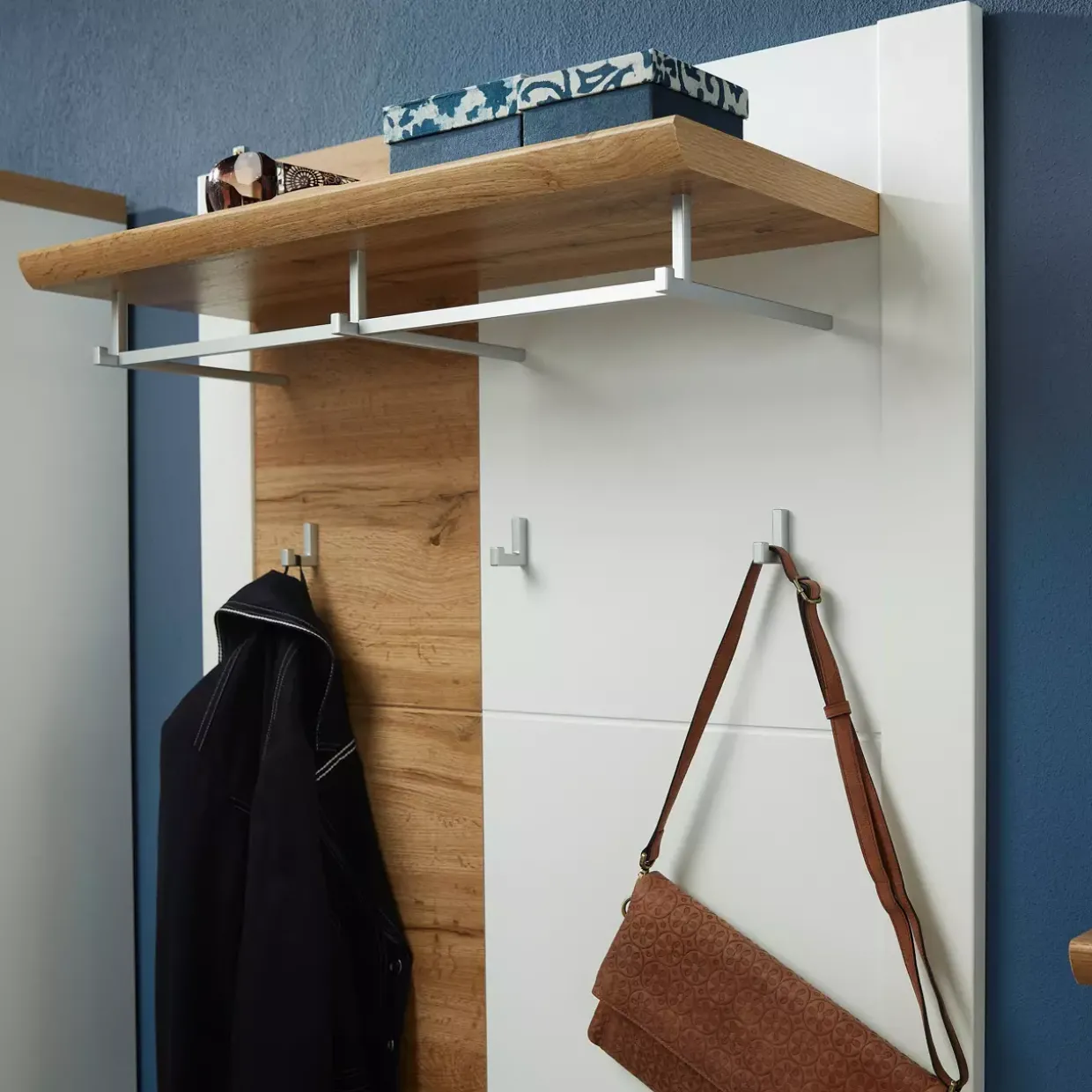 Ein weiteres Highlight dieser Garderobe ist der durchdachte Stauraum: Ein Boden mit Kleiderstange ermöglicht das ordentliche Aufbewahren von Jacken und Mänteln. Zusätzlich bieten drei Garderobenhaken ausreichend Platz für Taschen, Schals oder Hüte. Durch die klare Linienführung und den funktionalen Aufbau passt dieses Möbelstück ideal in den Eingangsbereich und schafft Ordnung auf elegante Weise.