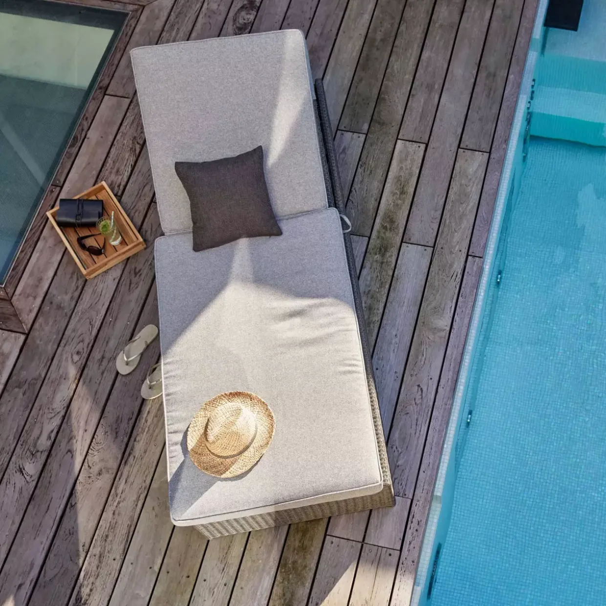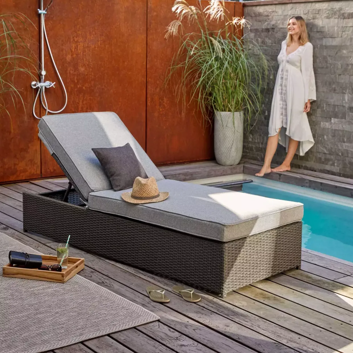 Die Oberfläche der Liege ist in einem stilvollen Geflecht gehalten, das nicht nur optisch ansprechend ist, sondern auch pflegeleicht. Die Kombination aus den verschiedenen Materialien macht dieses Möbelstück zu einem vielseitigen Begleiter für entspannte Stunden im Freien. Genießen Sie die warmen Tage des Jahres auf der Rügen Liege und lassen Sie den Alltag hinter sich. Hier trifft durchdachtes Design auf hohen Komfort, der Ihnen erholsame Momente beschert.
