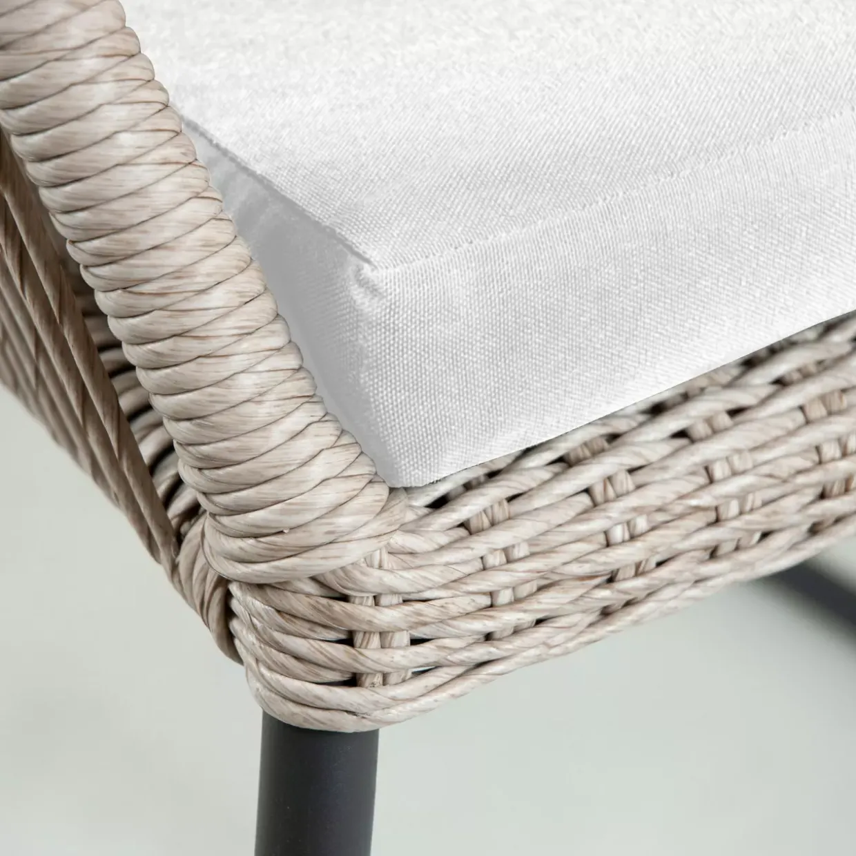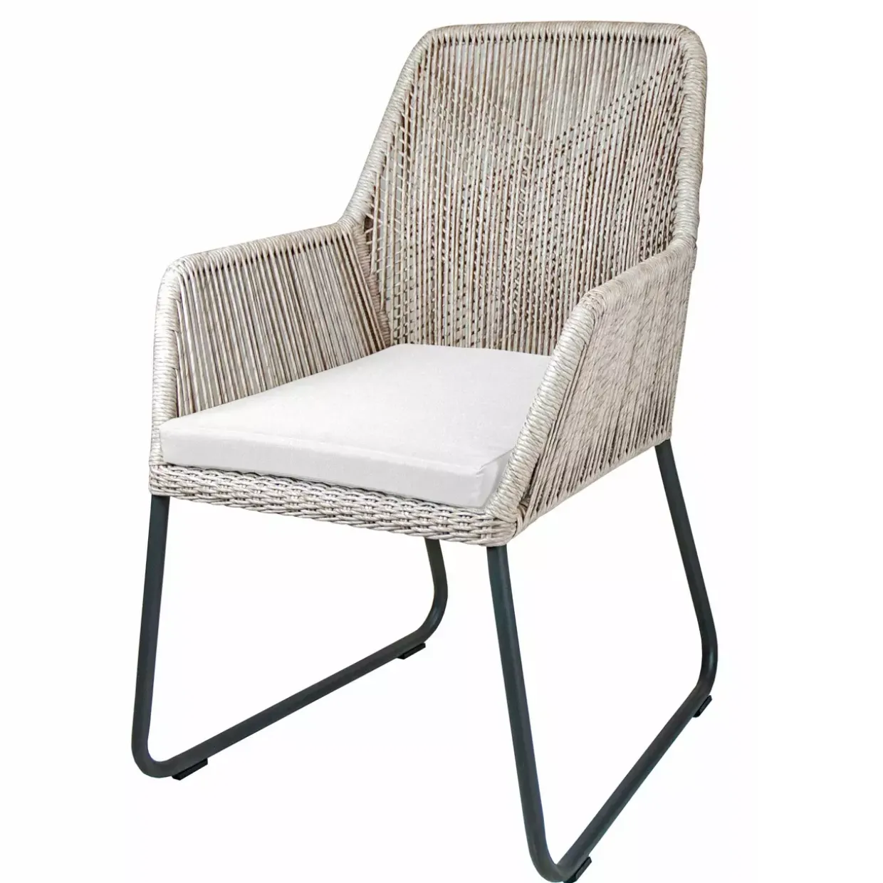 Eleganz und Funktionalität vereinen sich im Gartensessel Allanis. Die moderne Ästhetik des Stuhls wird durch die harmonische Kombination aus Beige und Southend White Sitzpolstern unterstrichen. Die Kufengestaltung des Fußes verleiht dem Möbelstück nicht nur Stabilität, sondern auch eine zeitgenössische Note, die sich nahtlos in jeden Außenbereich einfügt.