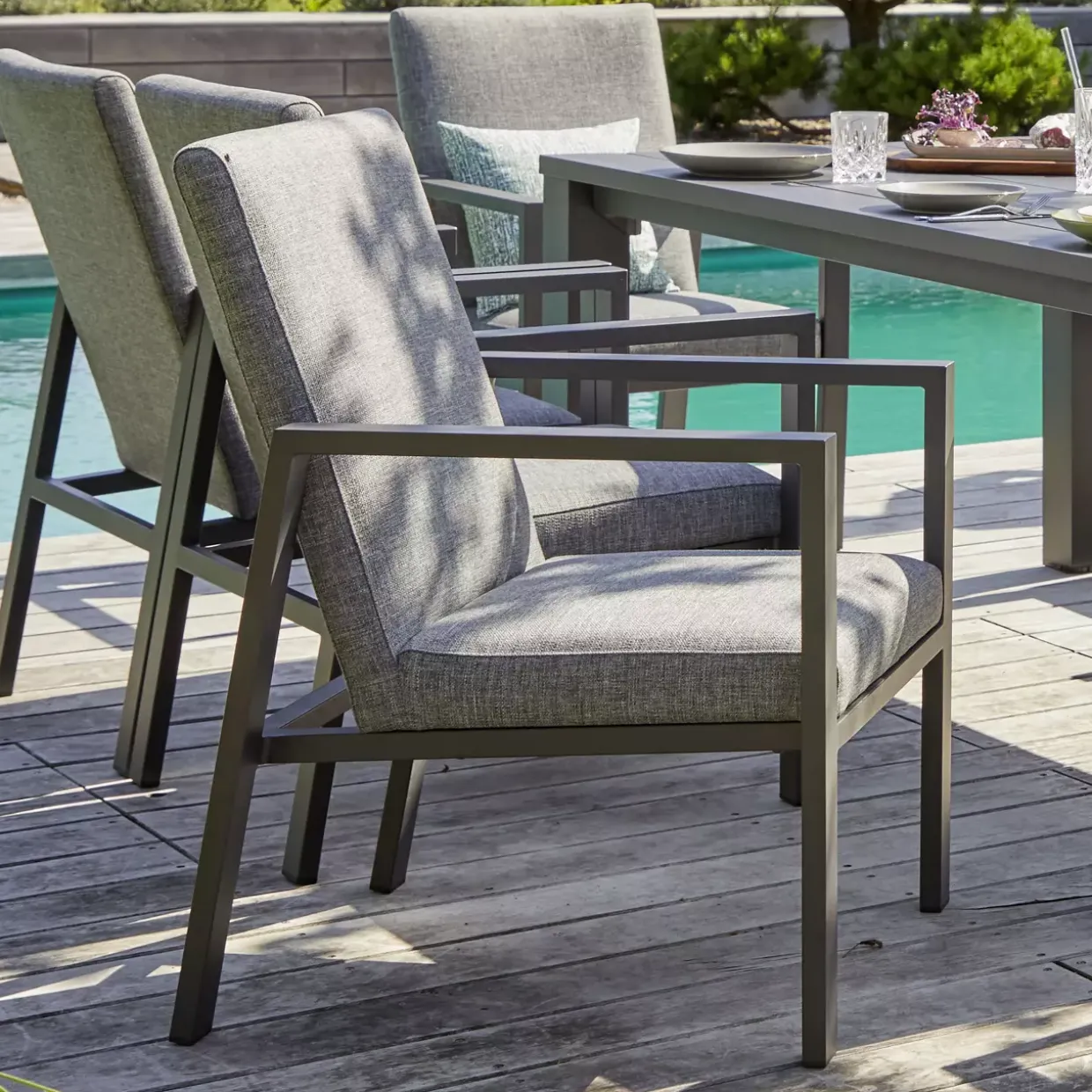 Die Sitzschale mit Polstersitz lädt zum Verweilen ein und macht lange Sommerabende im Garten noch angenehmer. In den zeitlosen Farbtönen Grau und Anthrazit fügt sich der Stuhl perfekt in jedes moderne Gartenambiente ein.