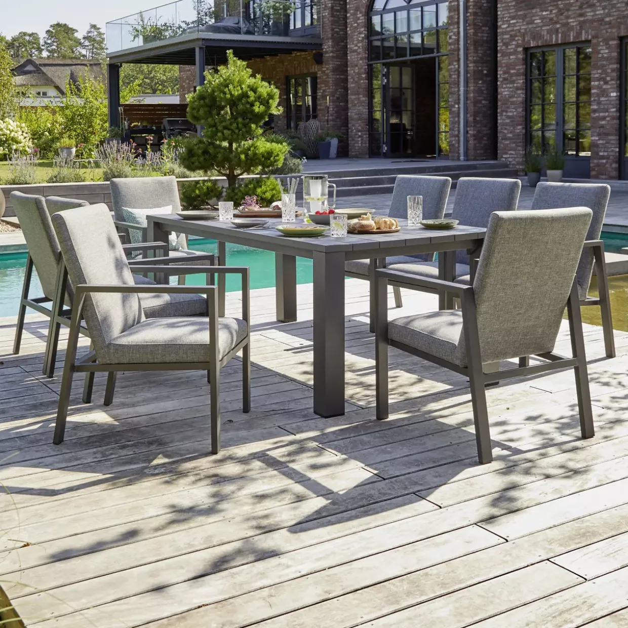 Aluminium, bekannt für seine Langlebigkeit und Widerstandsfähigkeit, sorgt dafür, dass der Gartenstuhl wetterfest und pflegeleicht ist. Der Stoffbezug ergänzt das hochwertige Erscheinungsbild und bietet eine angenehme Haptik.