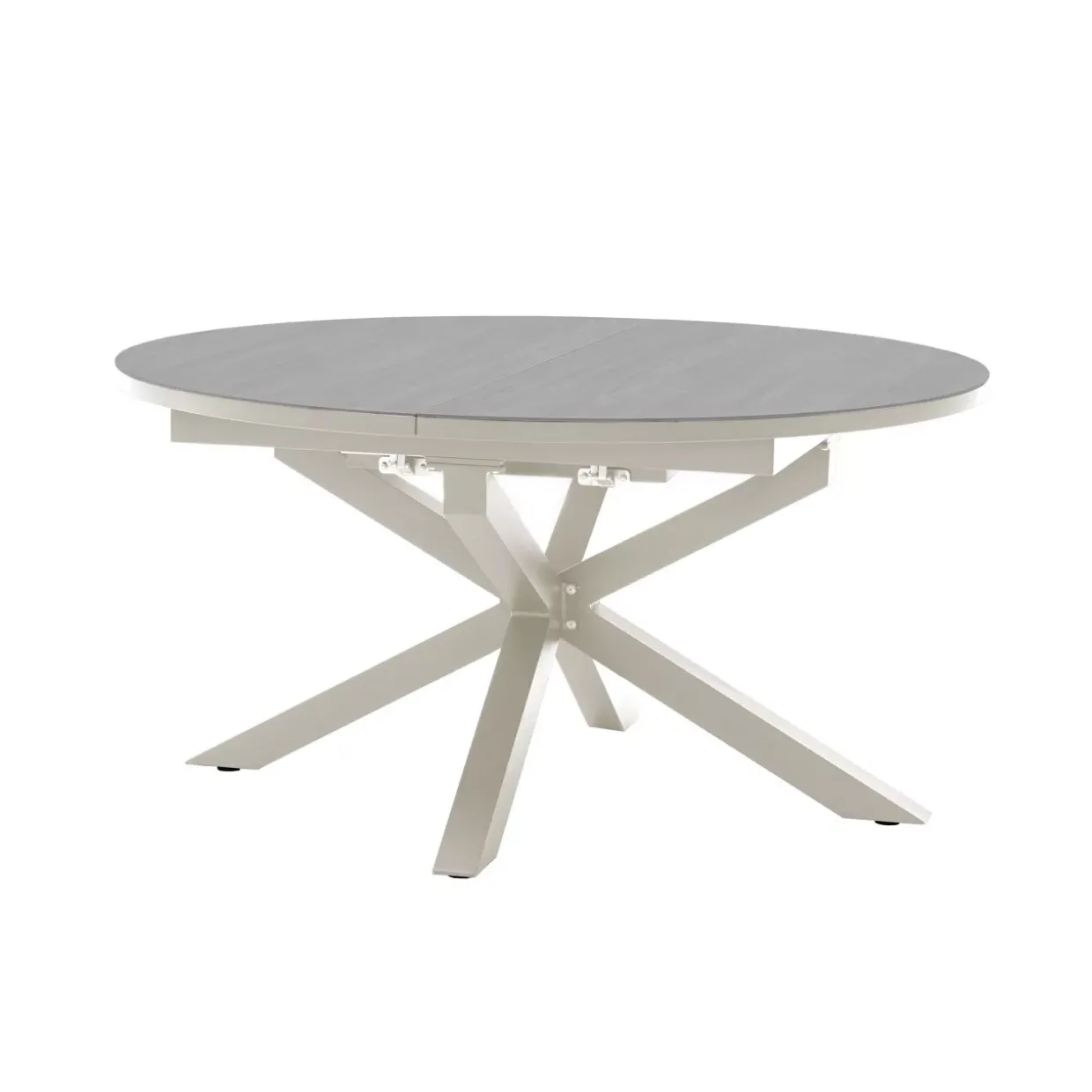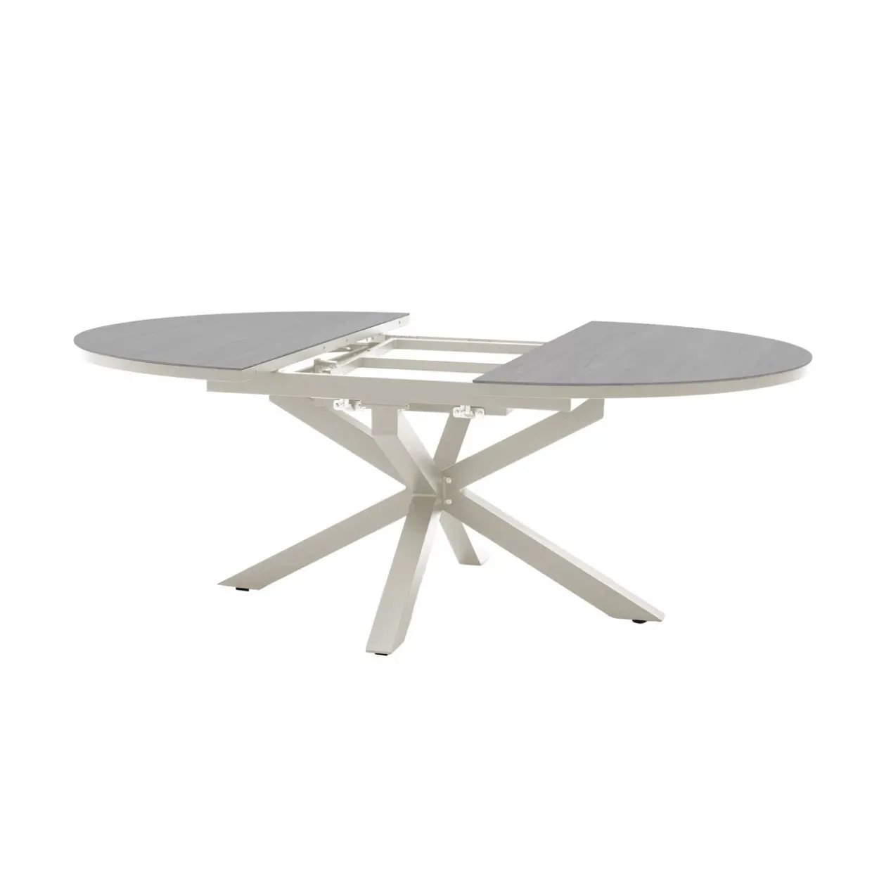 ausziehbar – camel -; Größe: O 145/199x145x75cm; Tischplatte : T6mm gesinterter Stein, beige; Rahmen: 65306;50x15x1.2mm, 30x20x1.2mm, 40x20x1.2mm, 70x70x1.5mm; Pulverbeschichtung in matt camel
