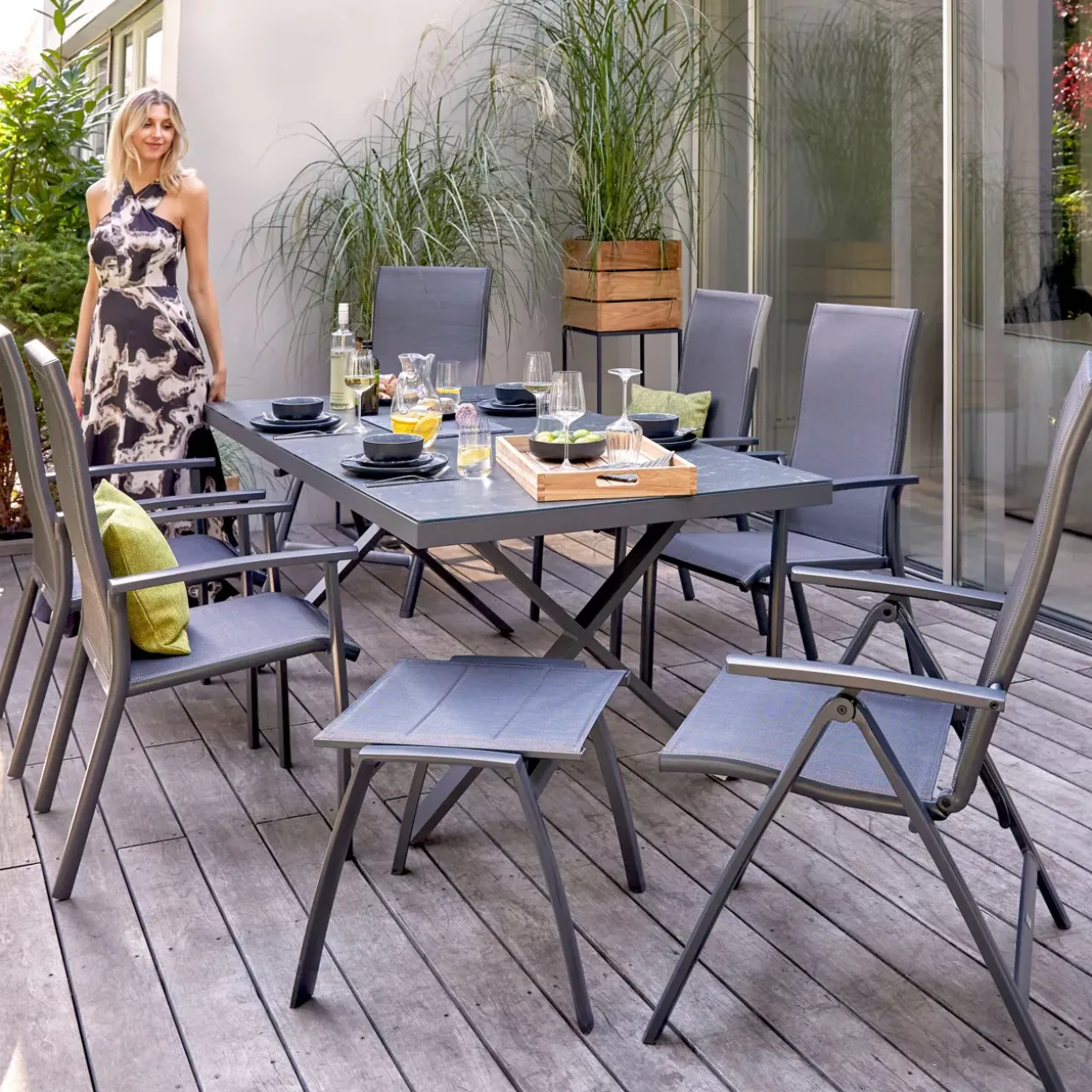 Das verwendete Aluminium zeichnet sich durch seine Langlebigkeit und Wetterbeständigkeit aus, während die Glasoberfläche leicht zu reinigen ist und einen Hauch von Raffinesse hinzufügt. Diese Materialwahl macht den Tisch zu einem idealen Begleiter für jede Jahreszeit.
