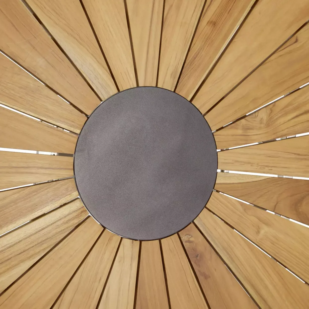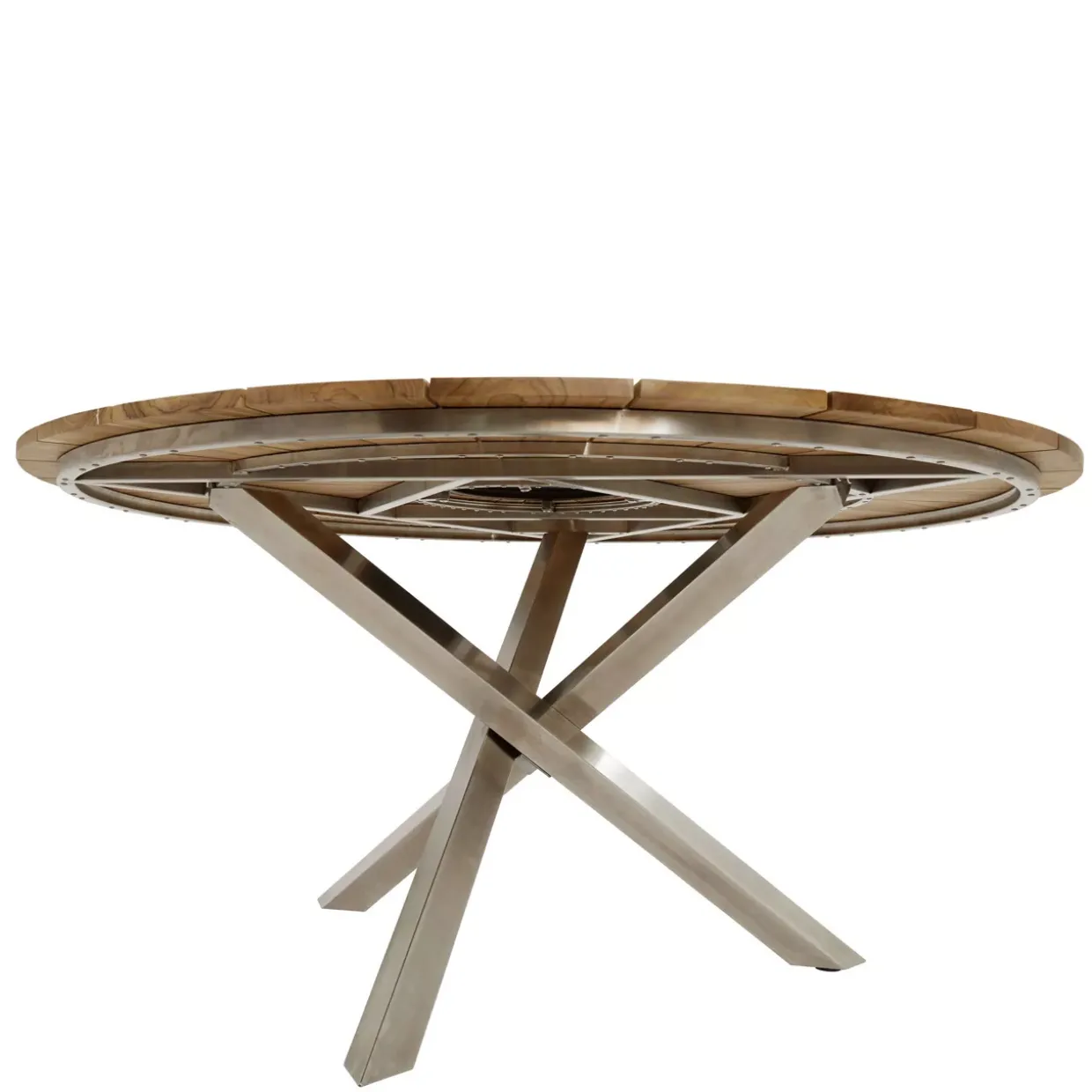 rund; ohne Drehscheibe; Beine: Edelstahl 304, 60x60x1,2; Gestell: 25x25x1,2; Tischplatte: Teakholz FSC 100%, Dicke 18; Beschläge: S/304;