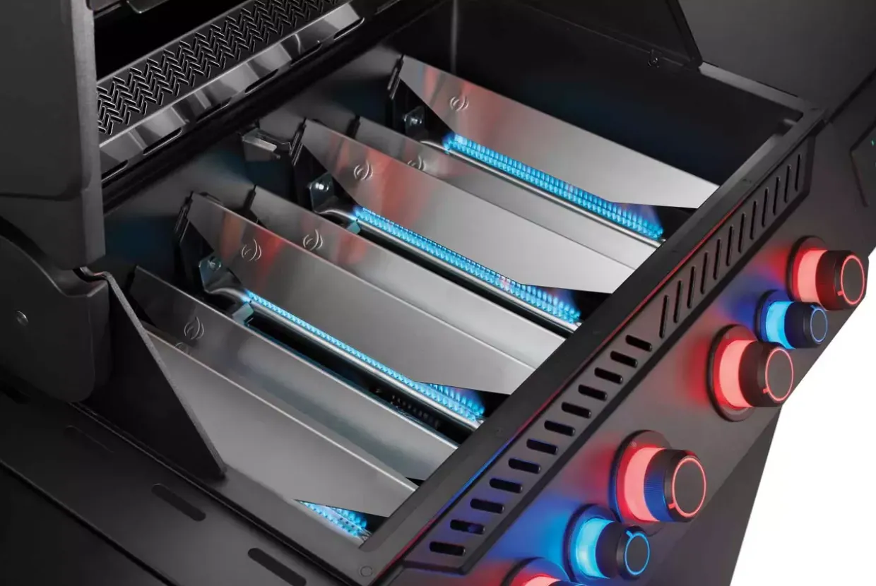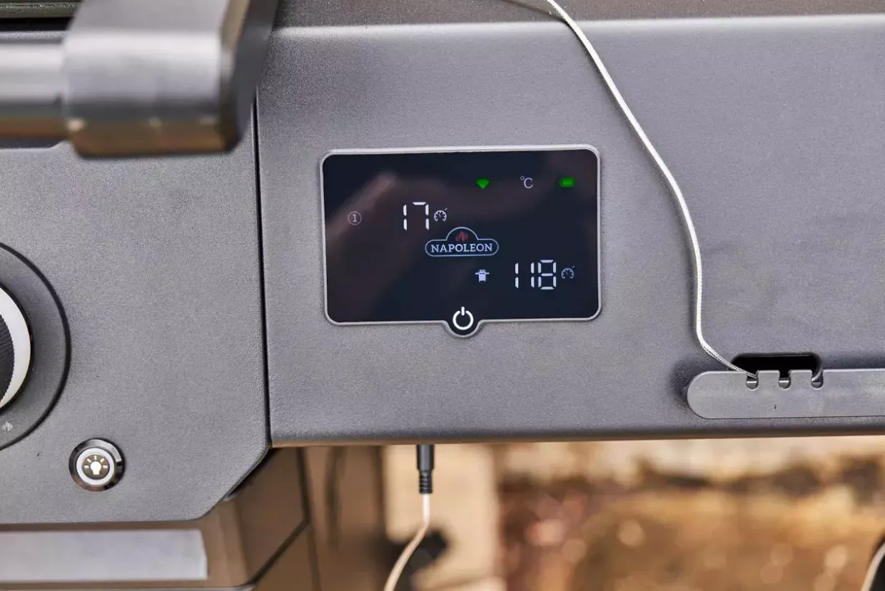WLAN- und Bluetooth-Konnektivität eröffnen neue Möglichkeiten des Grillens. Der moderne Grill im mattschwarzen Design aus robustem Edelstahl vereint Funktionalität und Stil. Der integrierte LCD-Display ermöglicht die Fernüberwachung der Temperatur und unterstützt Sie mit einer praktischen Grillhilfe. Innovative Roste aus gegossenem Edelstahl sorgen für optimale Hitzeverteilung und ein gleichmäßiges Grillergebnis. Ein besonderes Highlight ist die SIZZLE ZONE mit Infrarot-Seitenbrenner, die ein schnelles Anbraten ermöglicht. Der Heckbrenner erweitert die Zubereitungsmöglichkeiten zusätzlich. Dank der fixierbaren Lenkrollen nach Industriestandards lässt sich der Grill leicht bewegen und sicher platzieren. Die integrierten, abgeschirmten Anschlüsse für Temperaturfühler gewährleisten eine präzise Überwachung der Garprozesse. Sechs versteckte Werkzeughaken bieten praktischen Stauraum für Ihr Grillzubehör. Für Sicherheit und Komfort sorgen die LED-Kontrollknöpfe mit SafetyGlow-Funktion: Blau signalisiert ausgeschaltete Brenner, während Rot auf in Betrieb befindliche Brenner hinweist. Die Jetfire Zündung für die Hauptbrenner und das elektronische Zündsystem für die Sizzle Zone und den Infrarot-Heckbrenner garantieren eine zuverlässige Inbetriebnahme. Der Phantom verspricht ein herausragendes Grillerlebnis mit modernster Technologie und durchdachtem Design.