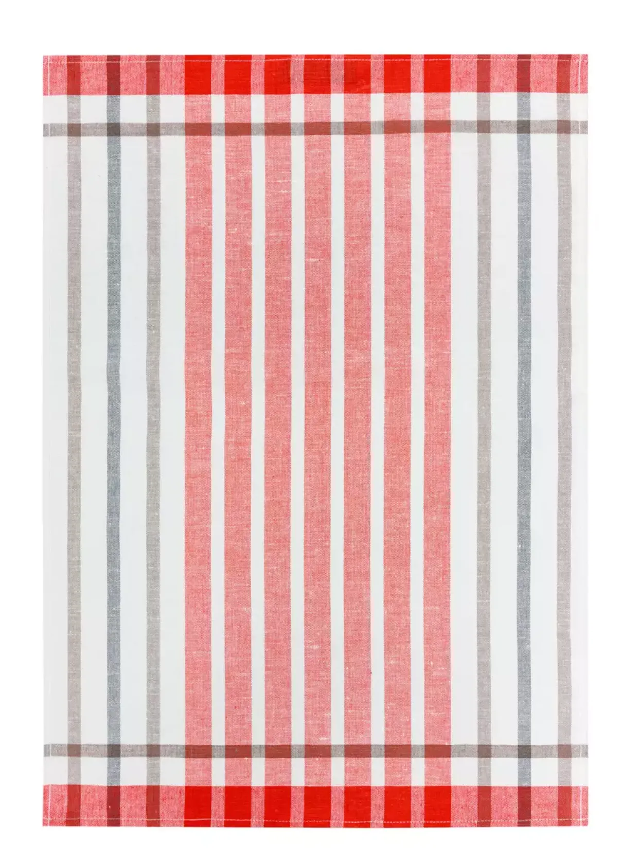 Ein modernes Geschirrtuch mit auffälligen Blockstreifen bringt frischen Wind in Ihre Küche. Die Kombination aus Baumwolle und Leinen verleiht dem Textil eine besondere Qualität, die sowohl robust als auch angenehm in der Handhabung ist. Der leuchtende Rotton sorgt für einen lebendigen Akzent auf Ihrem Küchentisch oder an Ihrem Haken.