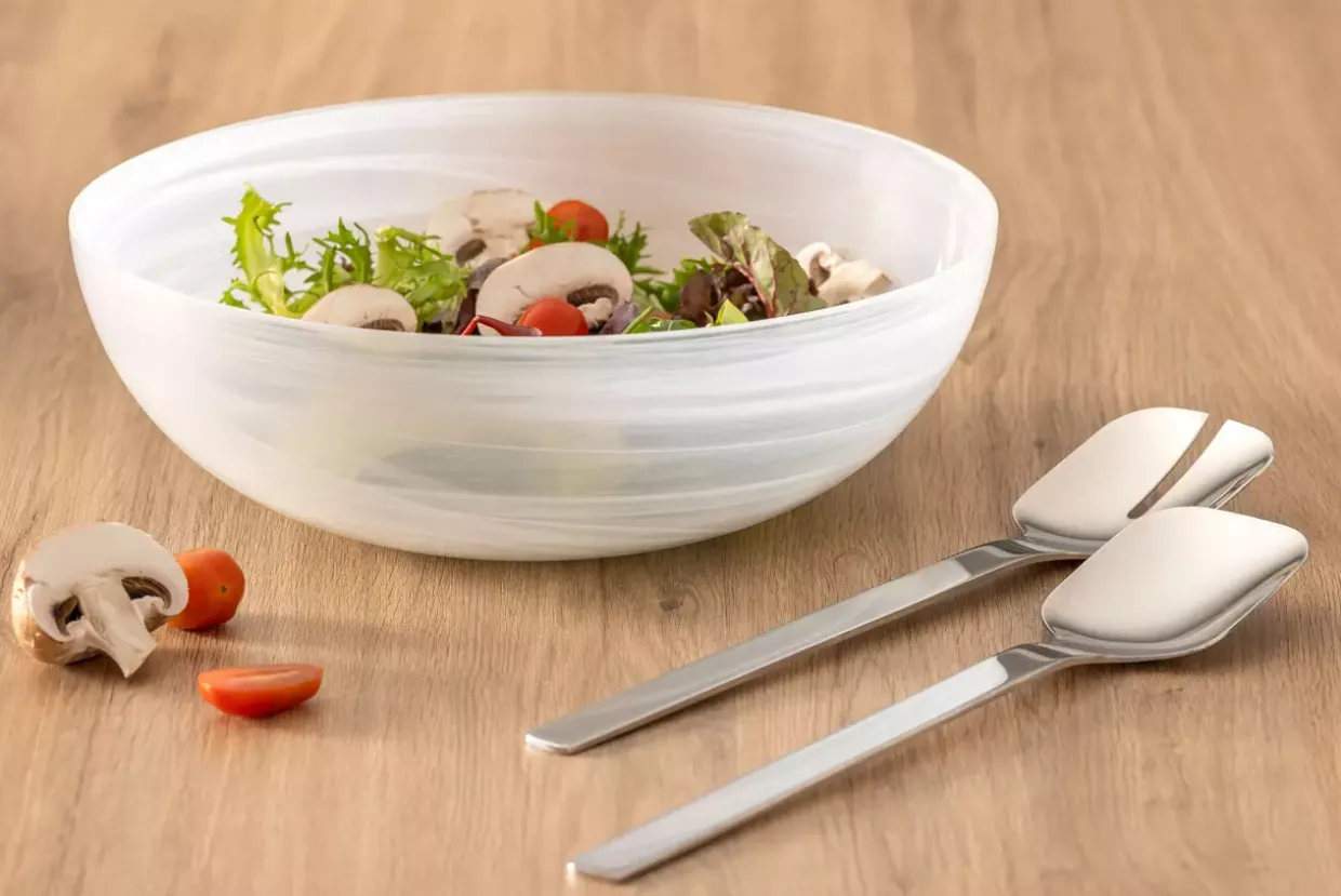 - 1 Glasschale weiß mit Salatbesteck Edelstahl