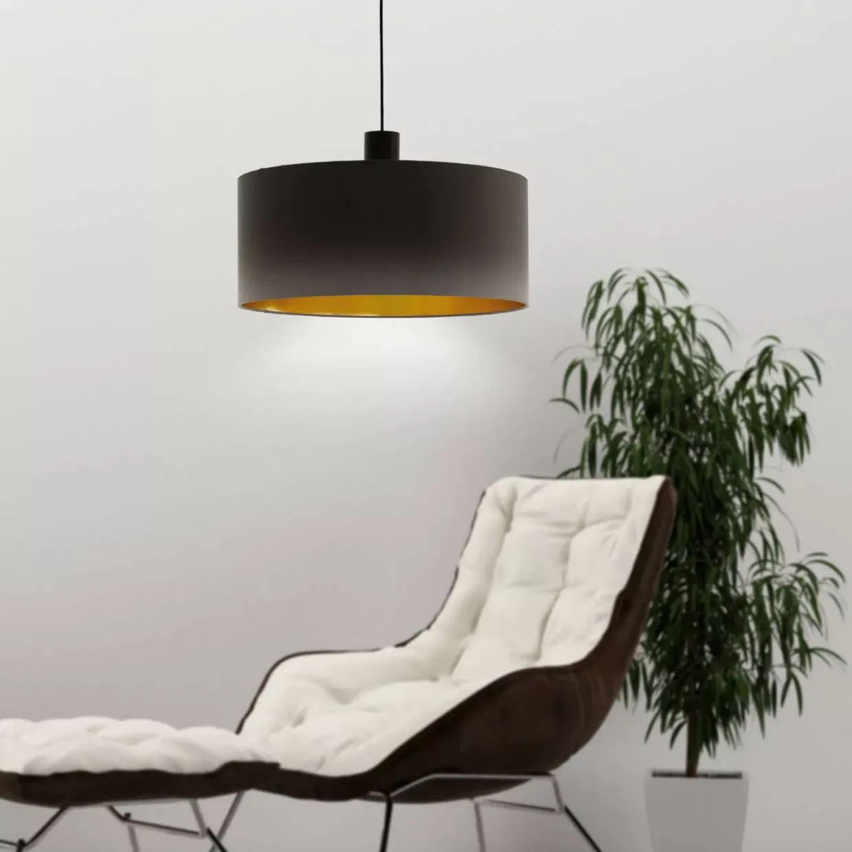 Die moderne Hängeleuchte Concessa verleiht jedem Raum zeitlose Eleganz. Dunkelbraun, Cappuccino und Gold harmonieren perfekt und schaffen eine warme Atmosphäre, die durch die warmweiße Lichtfarbe unterstrichen wird. Die Kombination aus Metall und Textil verleiht der Leuchte eine einzigartige Ästhetik, während der robuste Stahl für Stabilität sorgt.