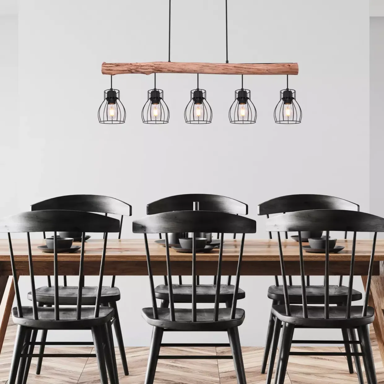 Hängeleuchte Metall schwarz, Holz naturfarben, Metall schwarz, Kabel PVC Schwarz, LxBxH: 1040x136x1400mm, exkl. 5x E27 40W 230V