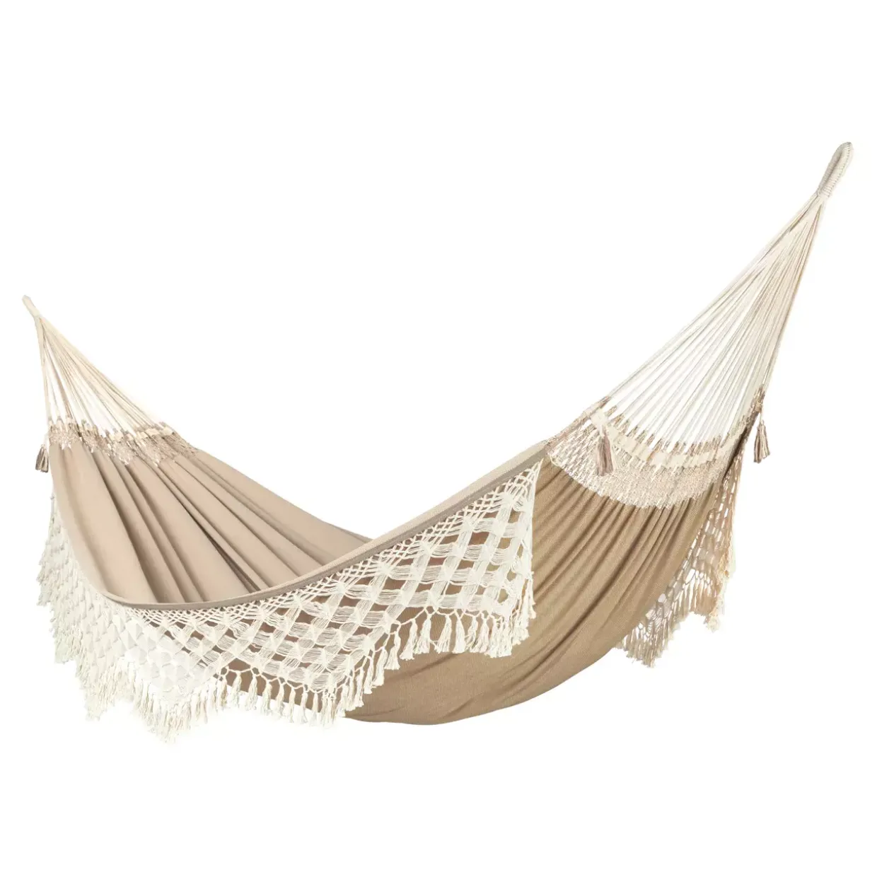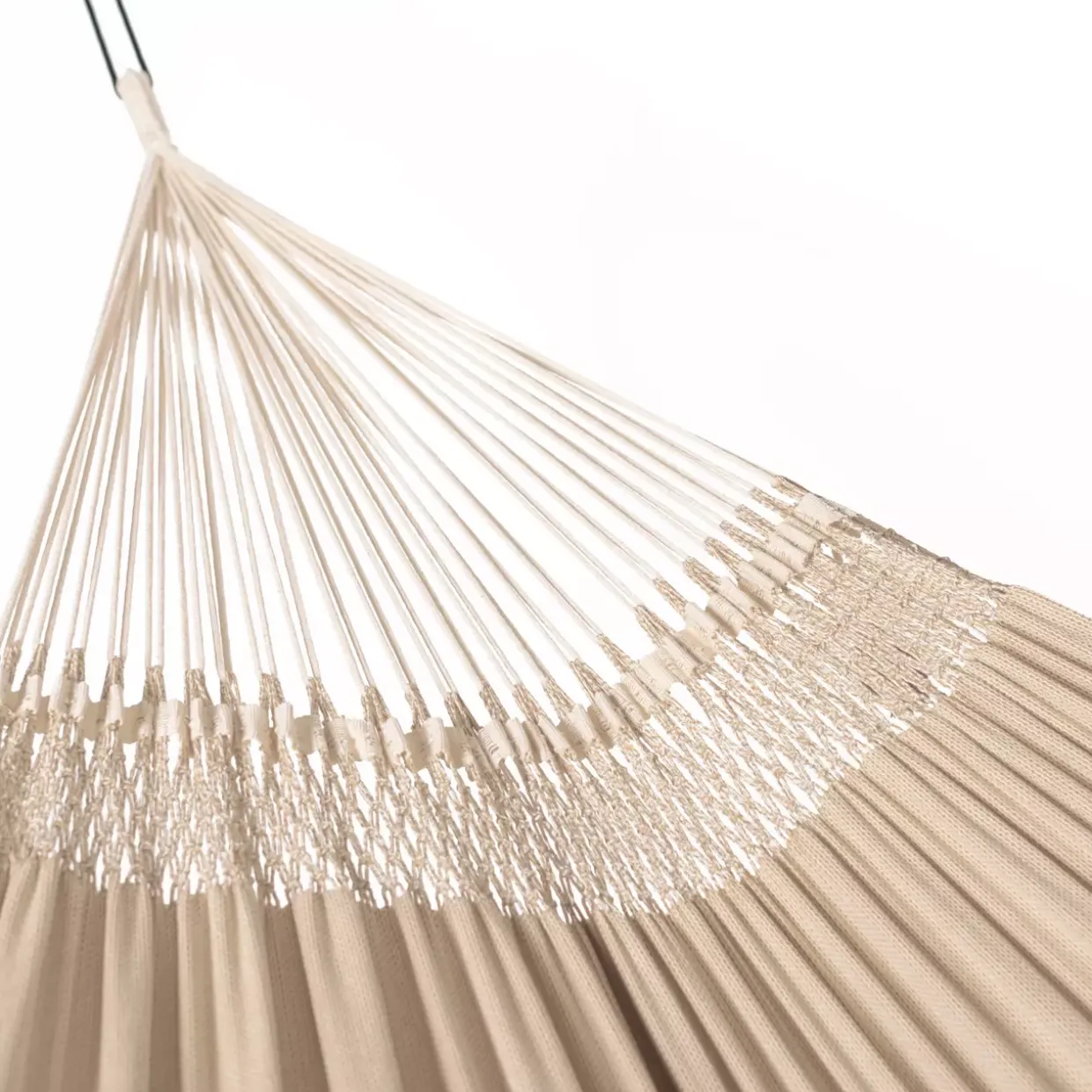 Baumwolle, als Textilart gewählt, bietet ein atmungsaktives und langlebiges Material, das Ihnen ein angenehmes Liegegefühl garantiert. Die Hängematte, gefertigt aus hochwertigem Textil, ist sowohl robust als auch pflegeleicht. Der natürliche Farbton unterstreicht die moderne Ästhetik und sorgt für eine beruhigende Atmosphäre.