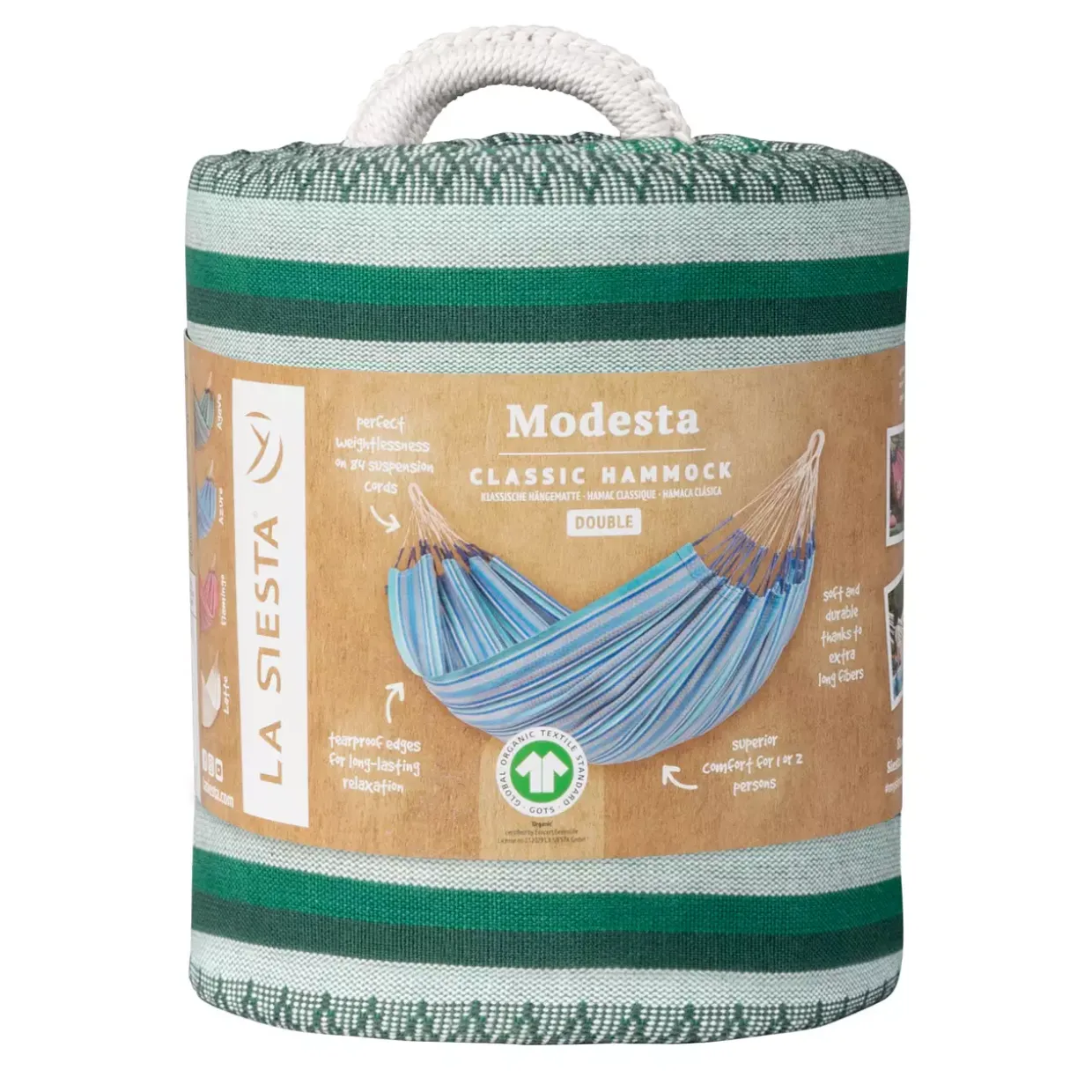 Modernes Design trifft auf die beruhigende Farbe Agave. Die Modesta Hängematte ist ein stilvolles Accessoire für Ihren Außenbereich, das gleichzeitig Komfort und Eleganz bietet. Gefertigt aus hochwertigem Textil, überzeugt die Hängematte durch die Verwendung von Baumwolle, die für ihre Weichheit und Beständigkeit bekannt ist. Diese Textilart sorgt für ein angenehmes Liegegefühl und ist zudem pflegeleicht.