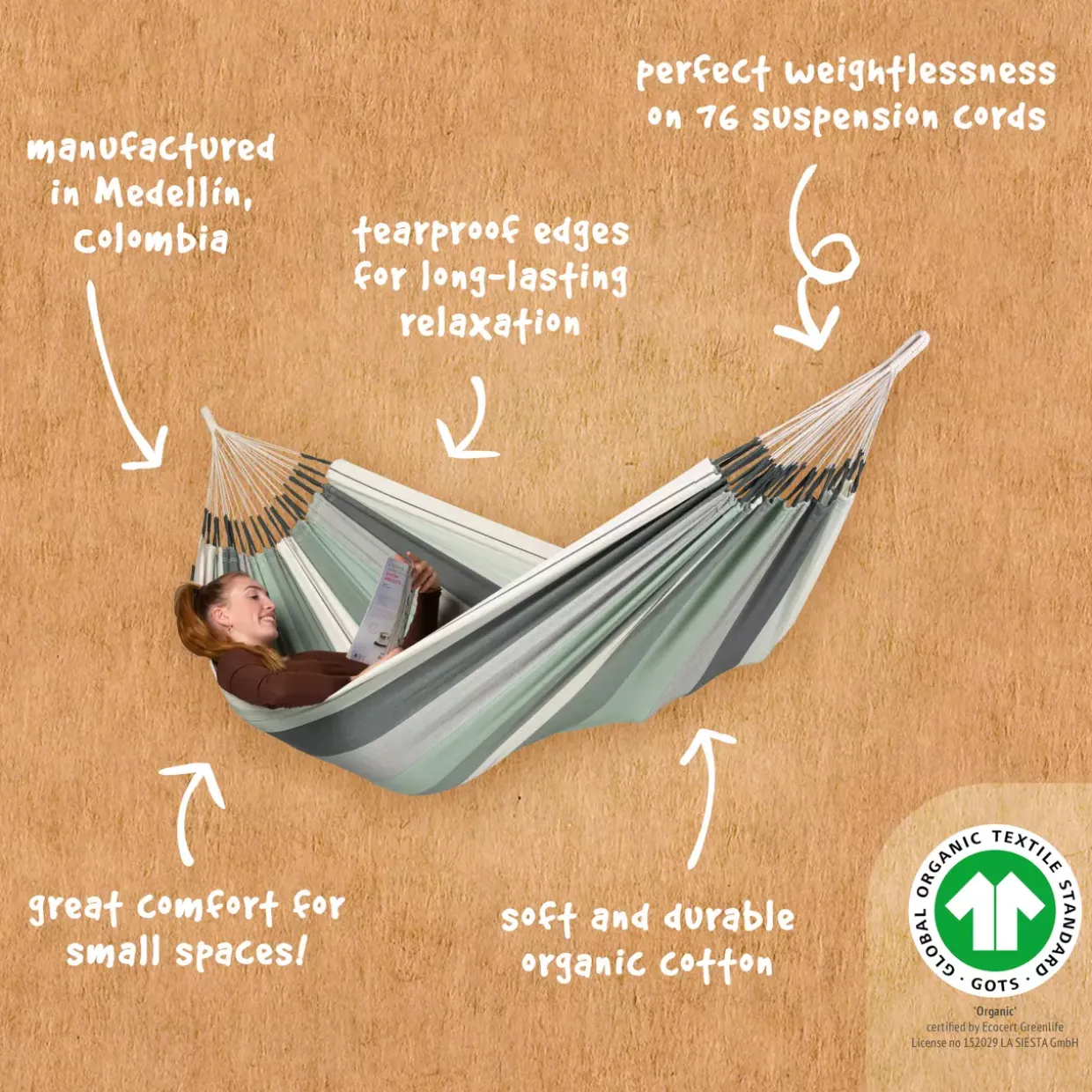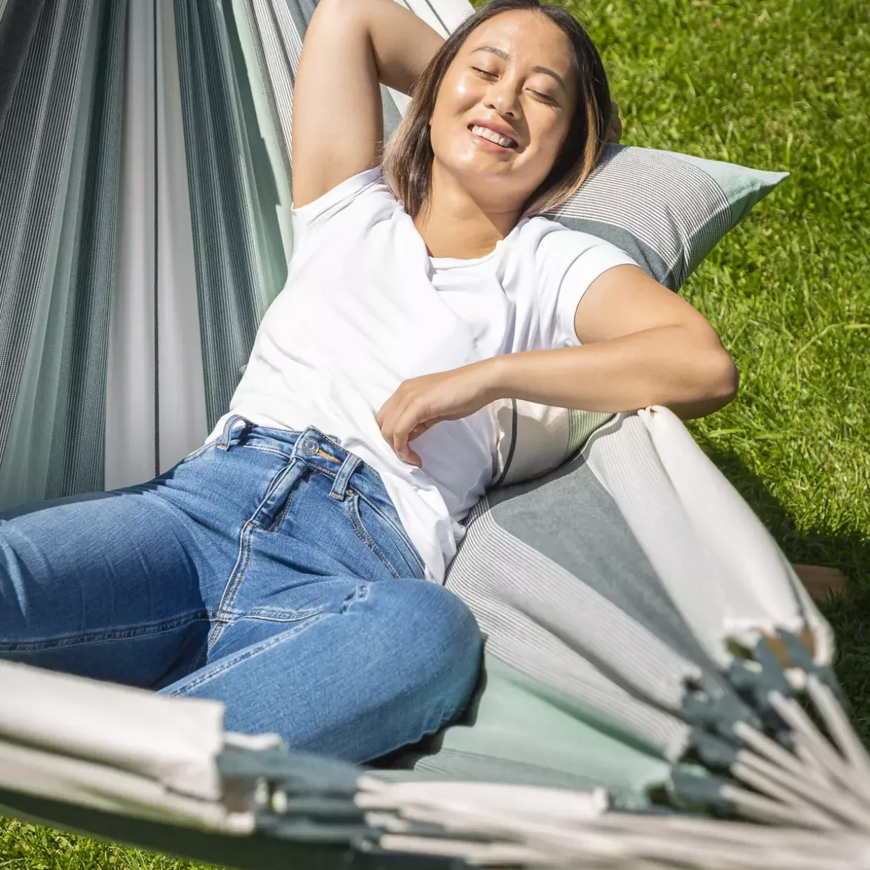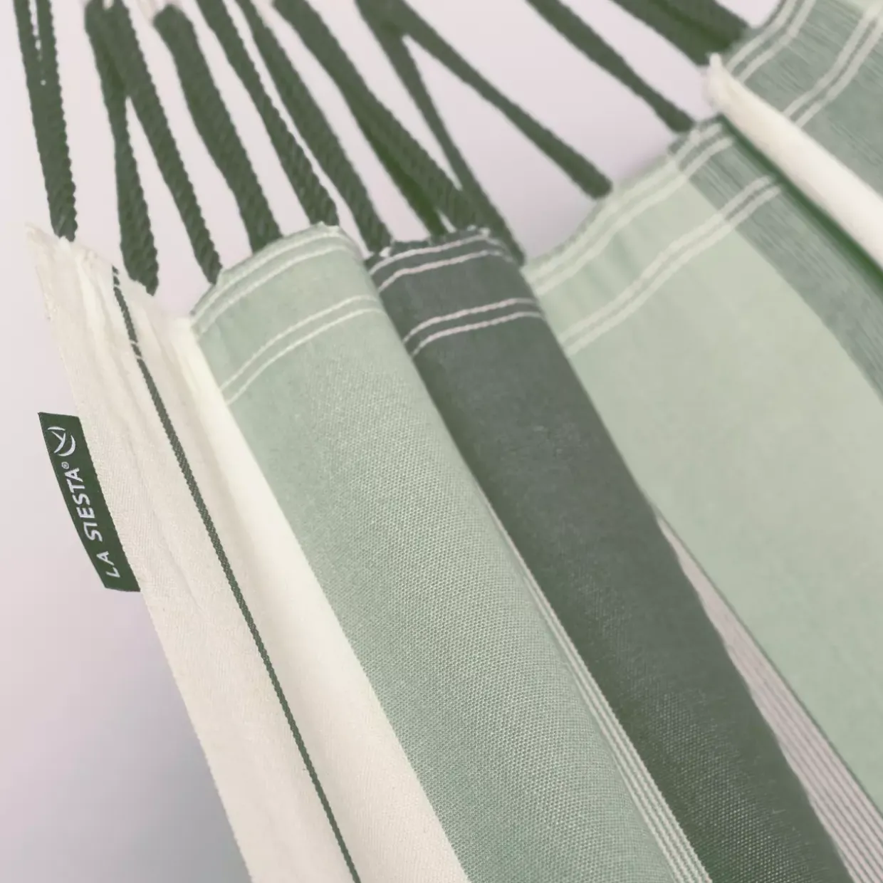 Olivefarbene Akzente verleihen der Modesta Hängematte eine zeitlose Eleganz, die Ihrem modernen Wohnstil schmeichelt. Das Modell Modesta verkörpert mit seinem klaren Design und der Verwendung von hochwertigem Textil eine gelungene Symbiose aus Ästhetik und Funktionalität. Gefertigt aus reiner Baumwolle, bietet diese Hängematte nicht nur eine angenehme Haptik, sondern auch eine hohe Atmungsaktivität, die besonders in den warmen Monaten für ein wohltuendes Liegegefühl sorgt.
