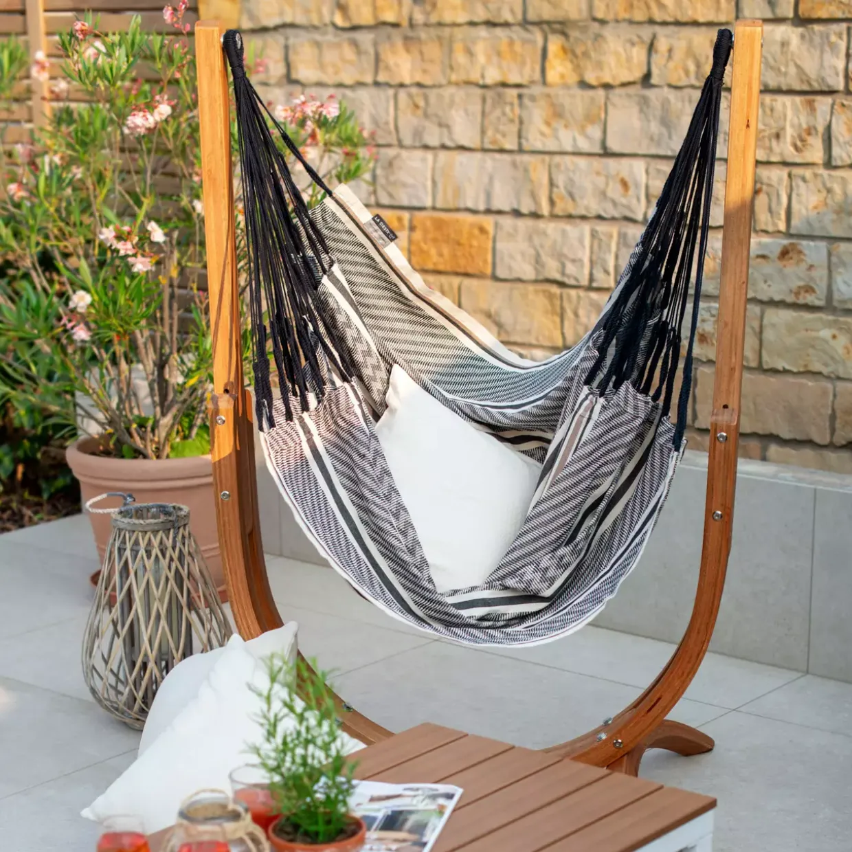 Genießen Sie die Ruhe und Geborgenheit, die dieser Hängesessel ausstrahlt. Die Verbindung von nachhaltigen Materialien und durchdachtem Design macht ihn zu einem idealen Begleiter für entspannte Stunden unter freiem Himmel. Diese bewusste Wahl für Ihren Garten reflektiert einen Lebensstil, der Wert auf Qualität und Umweltfreundlichkeit legt.