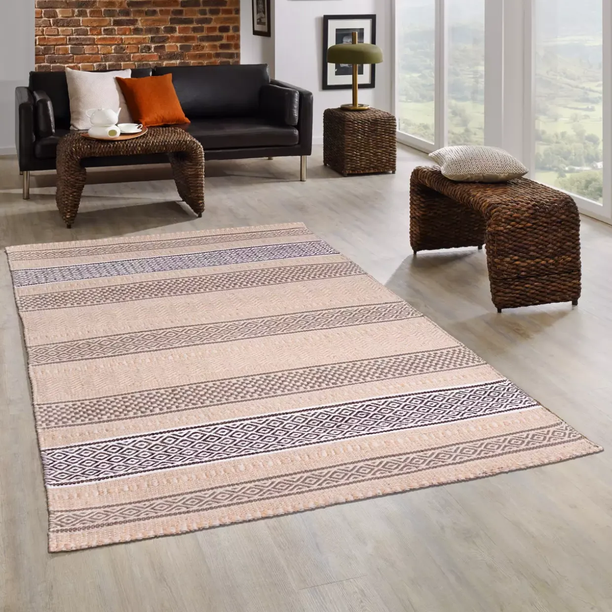 Handgewebt mit Hingabe und Präzision, der Handwebteppich Modell Toronto verkörpert modernen Stil in seiner buntesten Form. Das Flachgewebe aus einer hochwertigen Kombination von Baumwolle und Polyester bietet nicht nur eine angenehme Haptik, sondern auch Langlebigkeit. Durch die bunte Farbgebung wird jeder Raum mit lebendiger Energie erfüllt, während das moderne Design eine zeitgemäße Ästhetik unterstreicht.